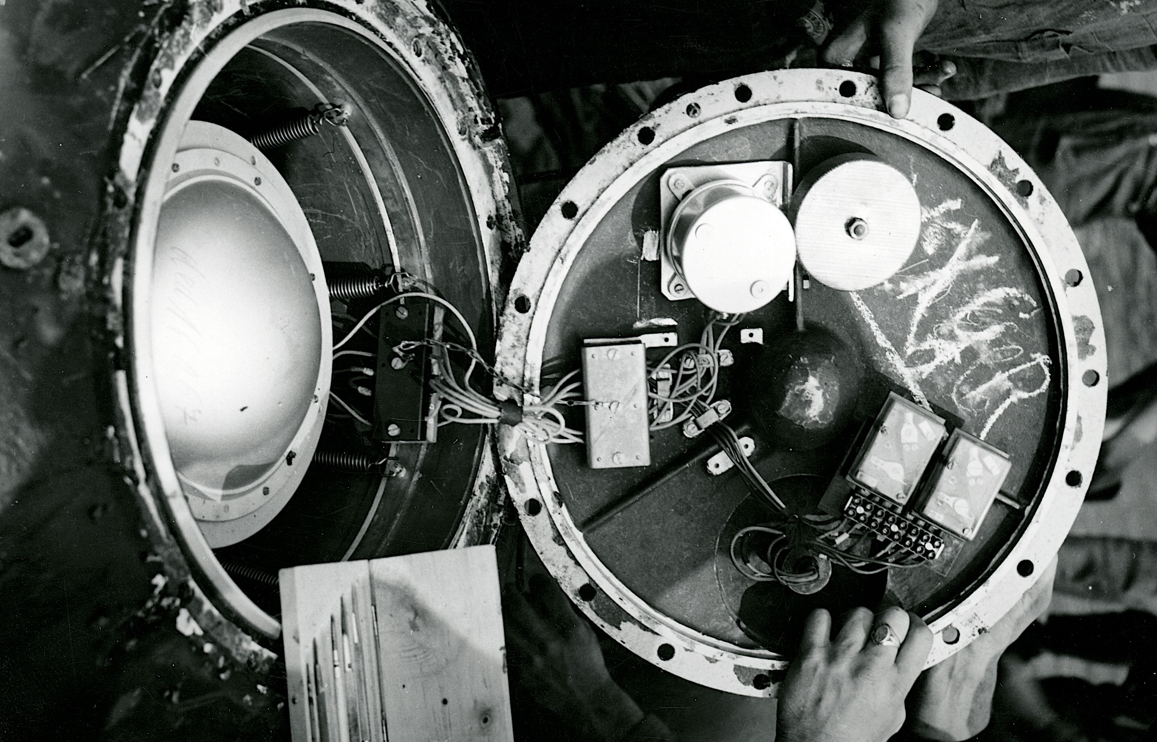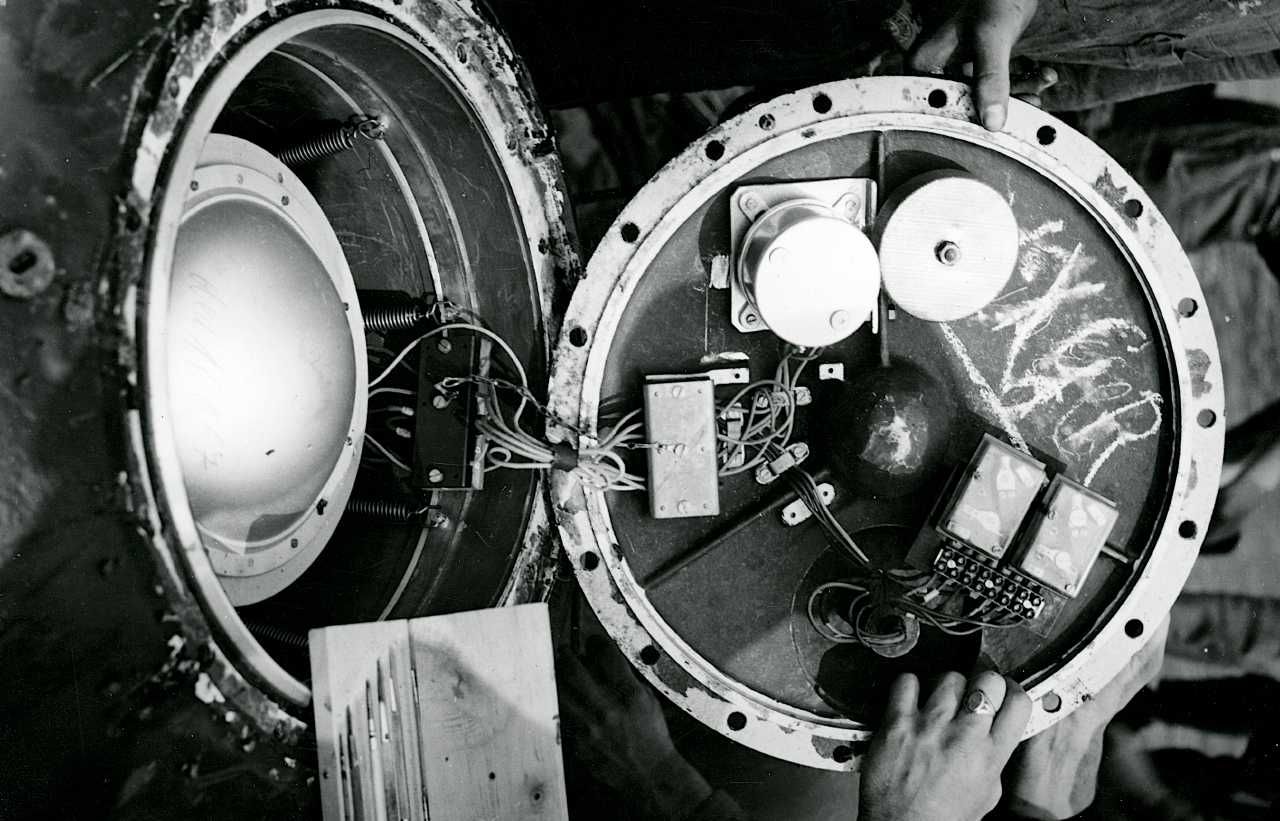 Maskingenkendt tekst fra fotokuvert: Det indre af en magnetisk demonteret mine fra Esbjerghavn.