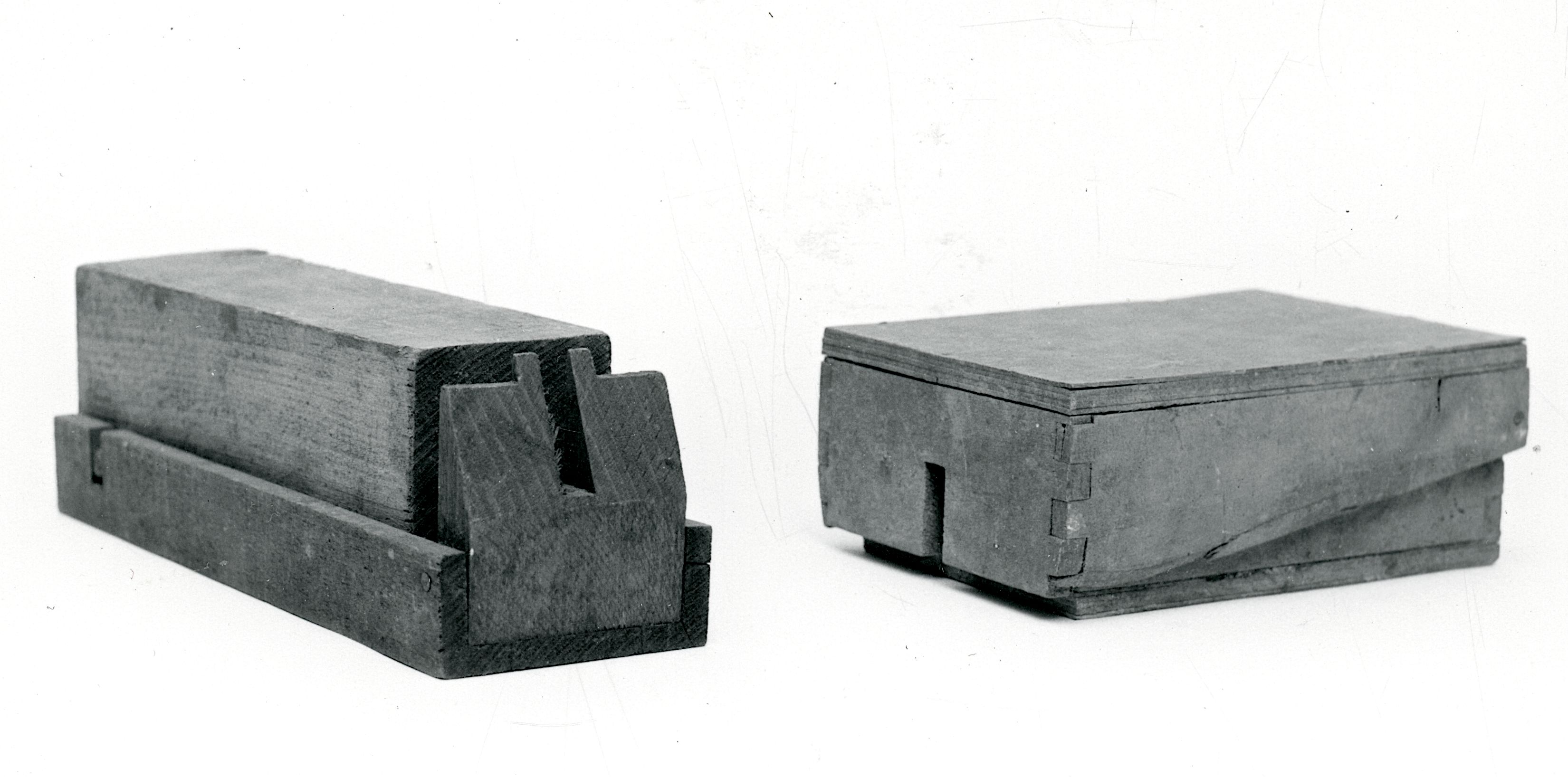 Maskingenkendt tekst fra fotokuvert: Små fodfolksminer af træ. Primitivt fremstillet. Benyttet af den tyske hær.