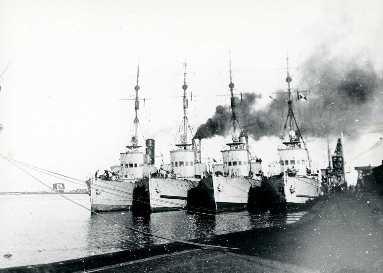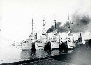 Maskingenkendt tekst fra fotokuvert: Beslaglagte norske minestrygere i Frederikshavn havn.