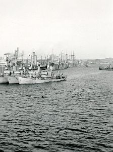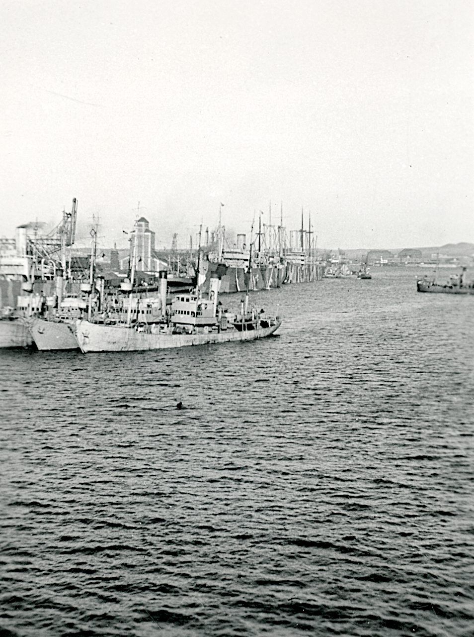 Maskingenkendt tekst fra fotokuvert: Krigsskibe. Ålborg Havn (?).