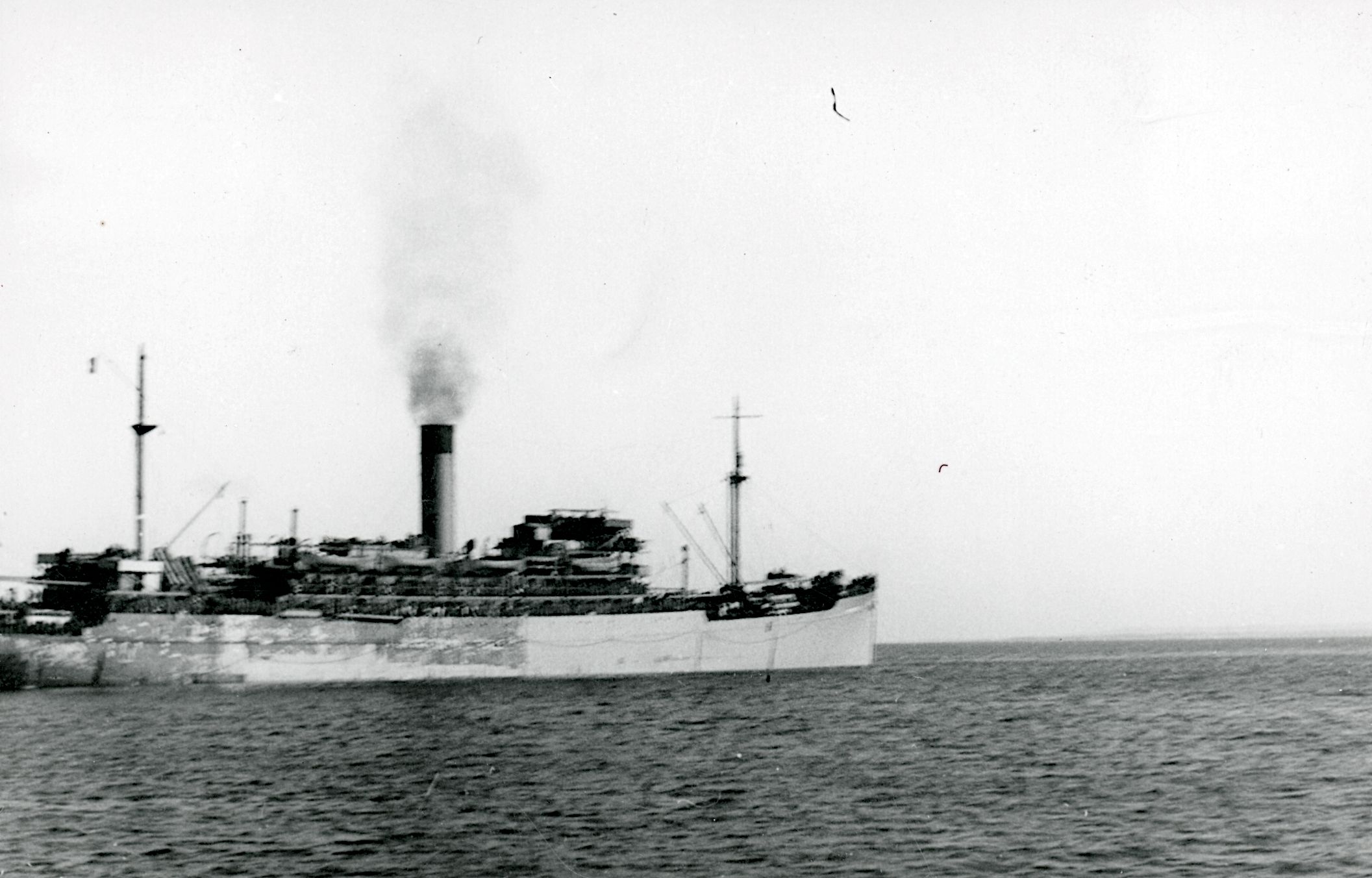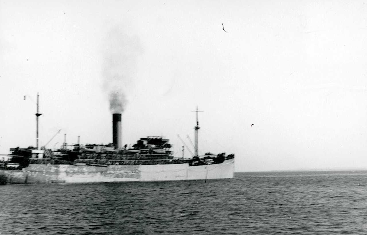 Maskingenkendt tekst fra fotokuvert: Fysktroppetransportskib afgår fra Århus med tropper til Norge.