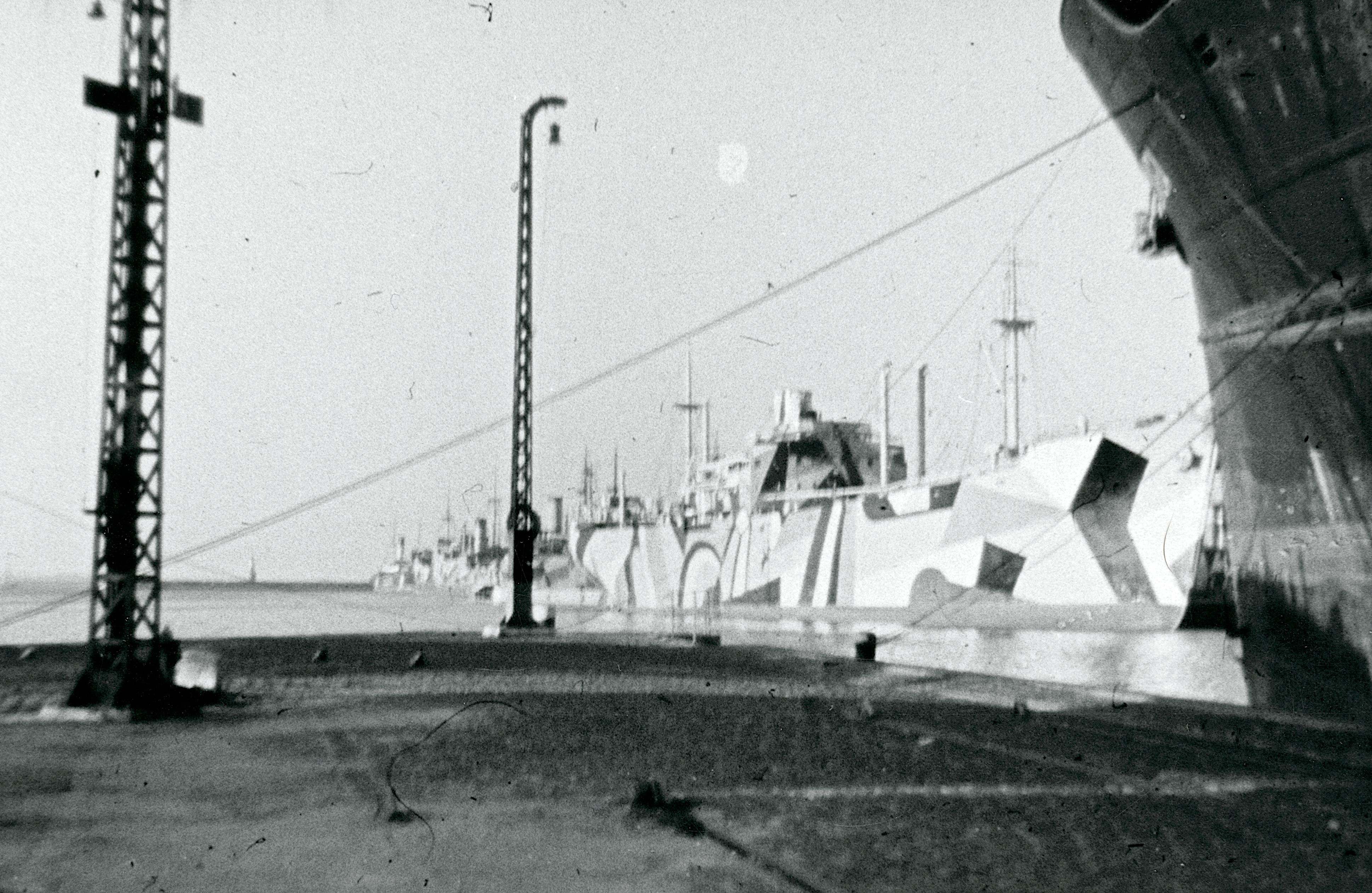 Maskingenkendt tekst fra fotokuvert: Camouflerede tyske skibe i Århus havn.