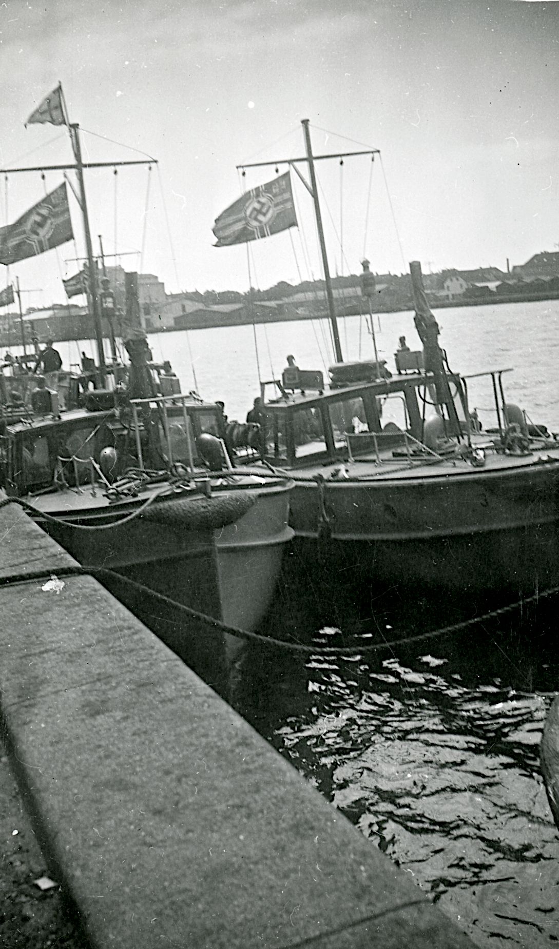 Maskingenkendt tekst fra fotokuvert: Krigsskibe. Tyske torpedobåde i Korsør Havn.