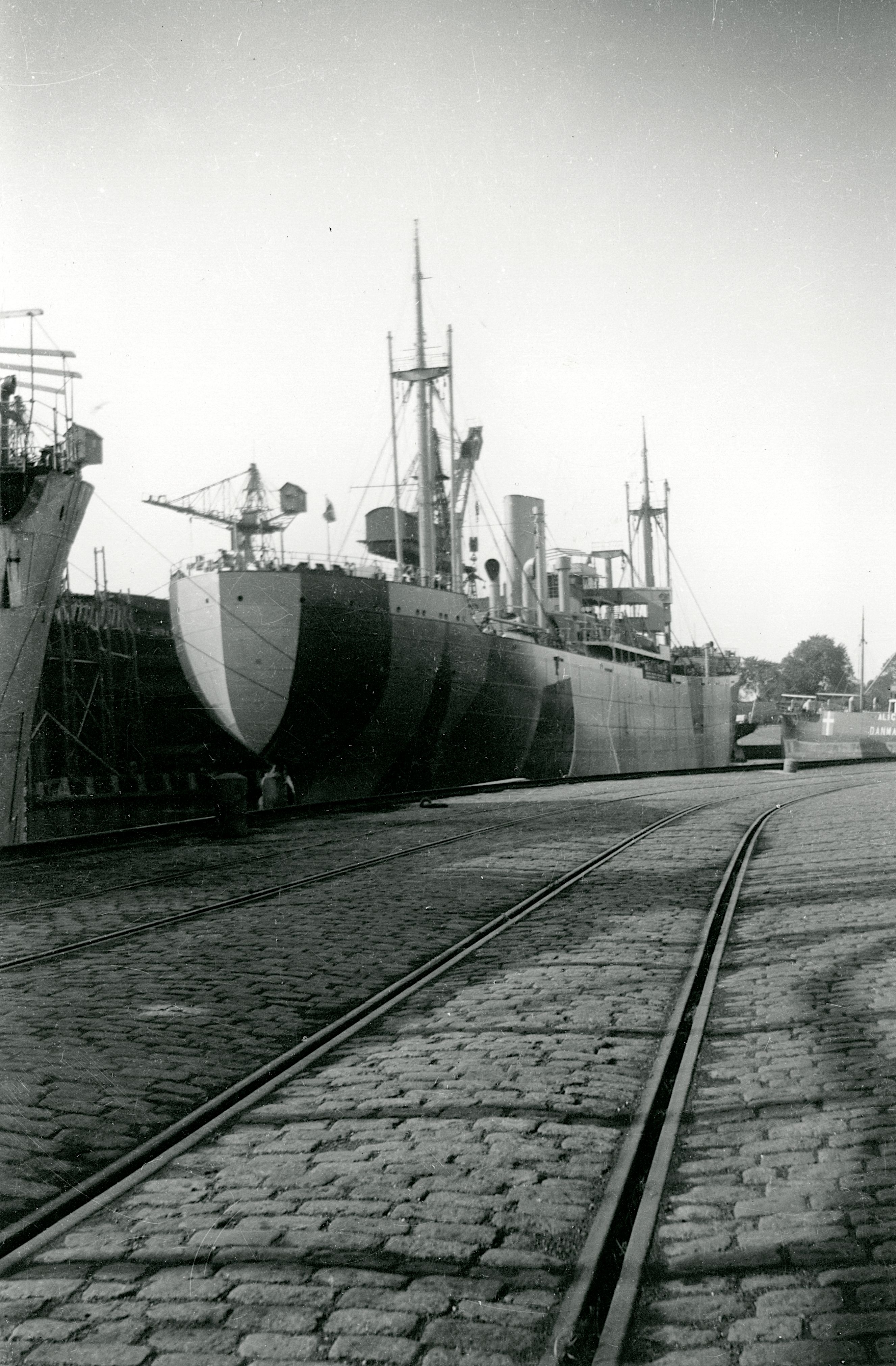 Maskingenkendt tekst fra fotokuvert: Camuflagemalet tysk skib i Helsingør havn