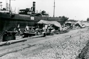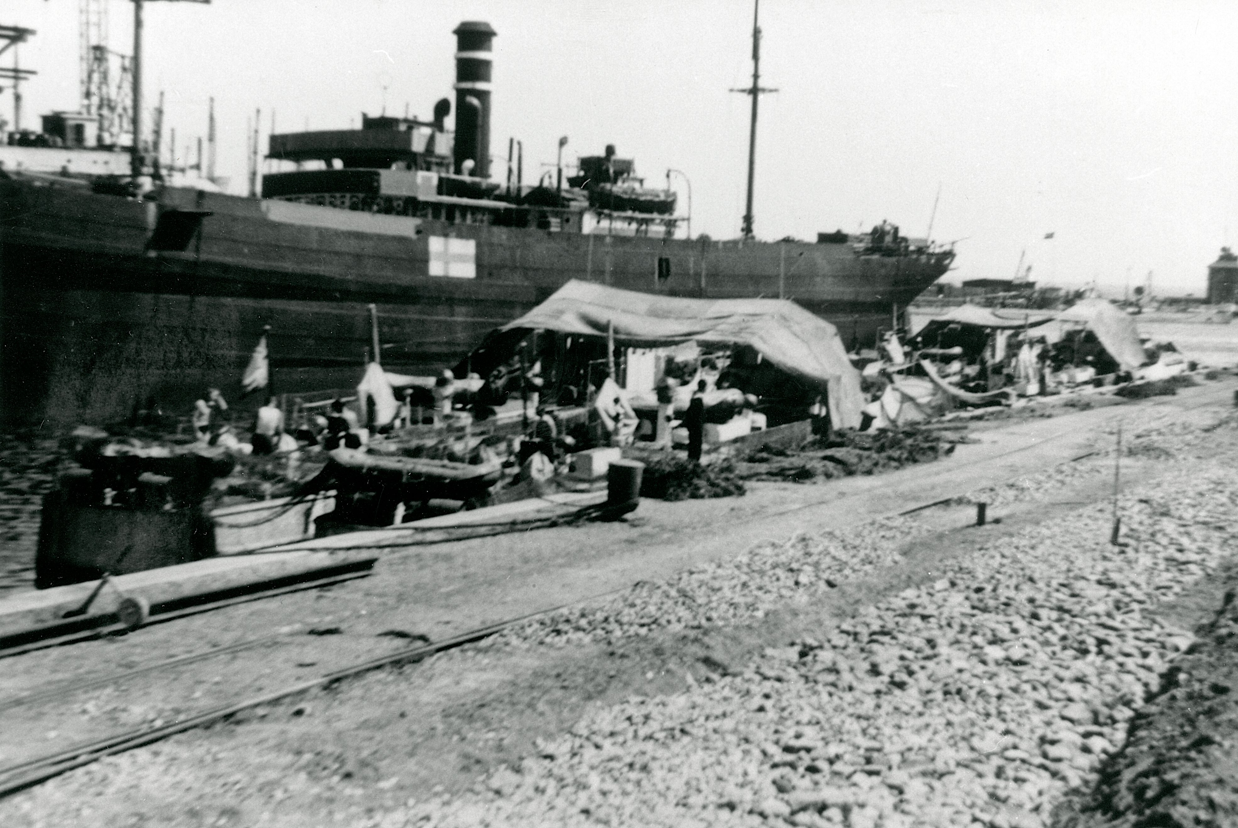 Maskingenkendt tekst fra fotokuvert: Tyske krigsskibe i Helsingør Havn. Det ligner hurtigbåde (Schnellboote)