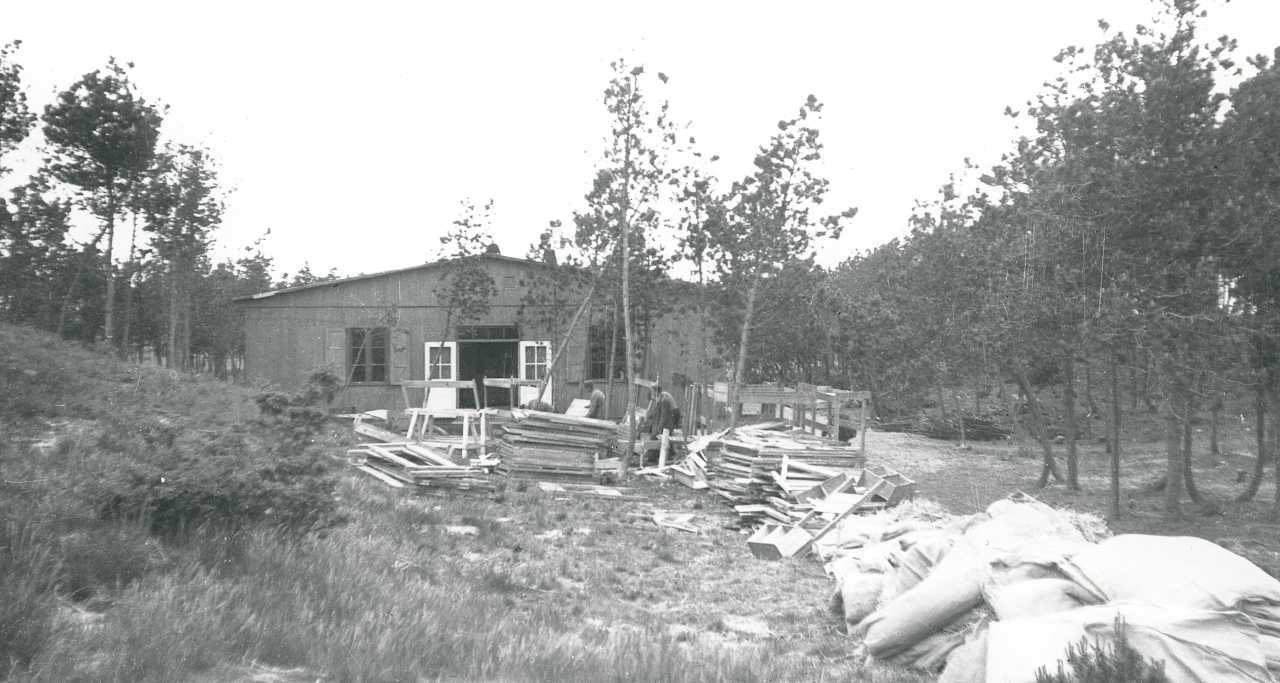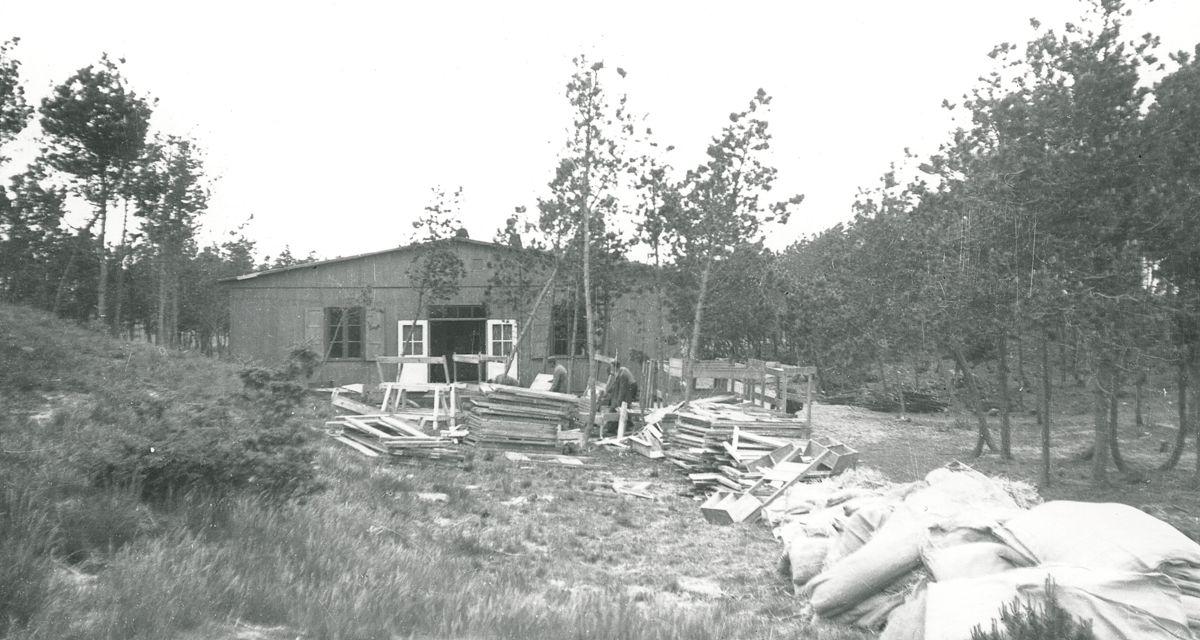 Maskingenkendt tekst fra fotokuvert: En af barakkerne i flygtningelejren på Heering Hede.