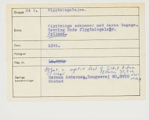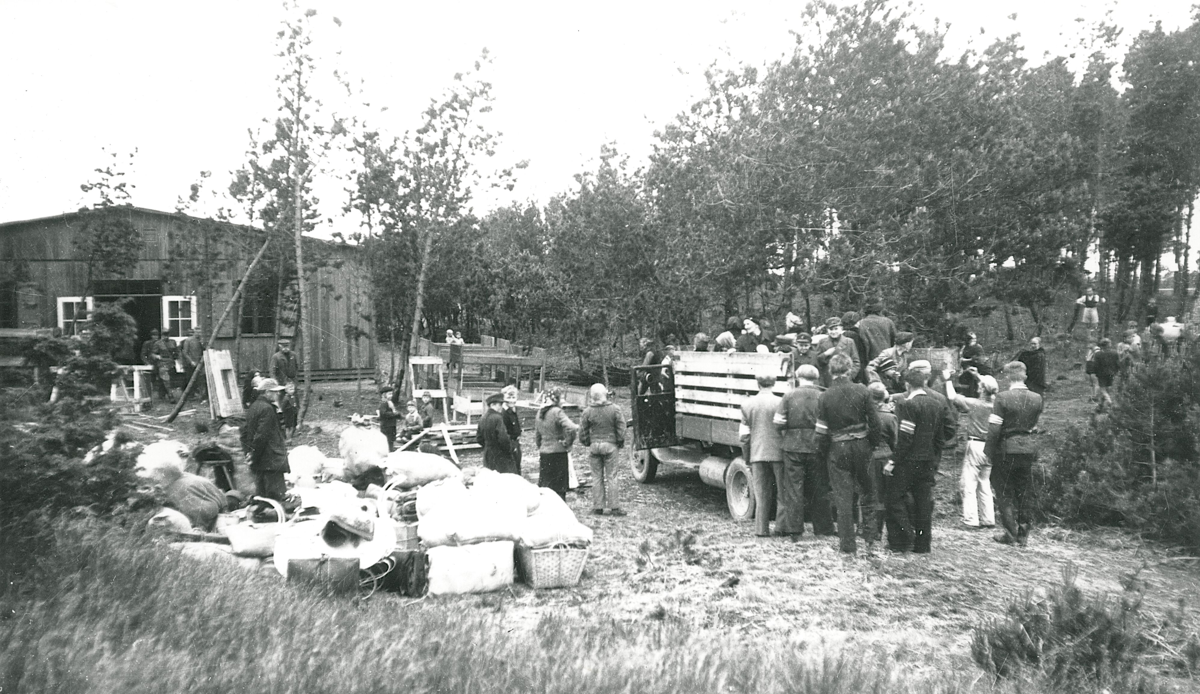 Maskingenkendt tekst fra fotokuvert: Flygtninge ankommer med deres bagage. Hevring Hede flygtningelejr. Jylland.