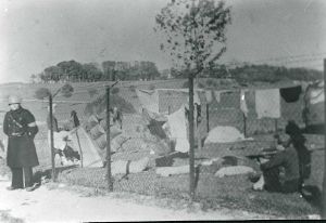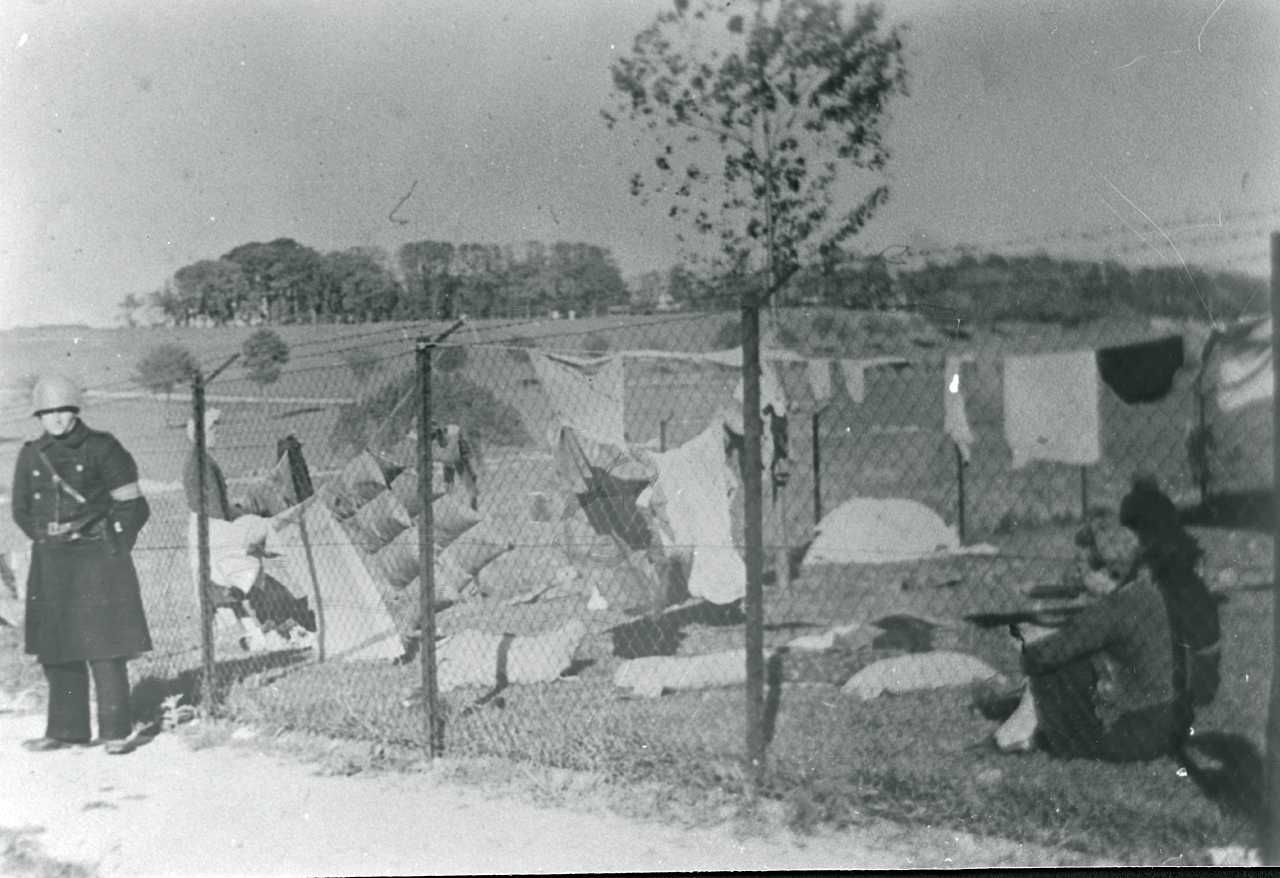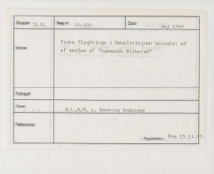 Maskingenkendt tekst fra fotokuvert: Tyske flygtninge i Høveltelejren bevogtet af af medlem af "Kommando Birkerød"
