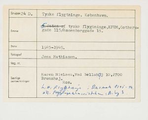 Maskingenkendt tekst fra fotokuvert: Tyske flygtninge, KFUM,Gothersgade 115/Rosenborggade 15.
