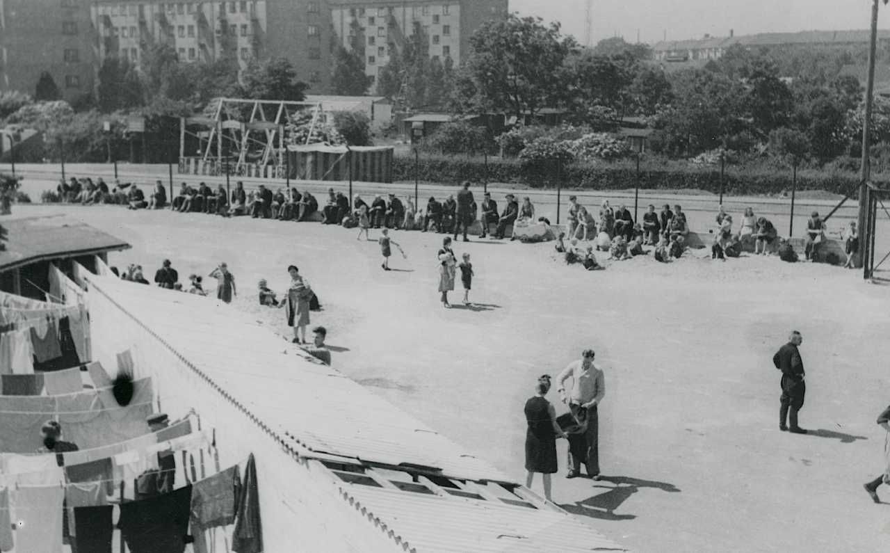 Maskingenkendt tekst fra fotokuvert: Fra flygtningelejren General Motors A/S . Aldersrogade 20, Kbhvn N. Legeplads for børnene.