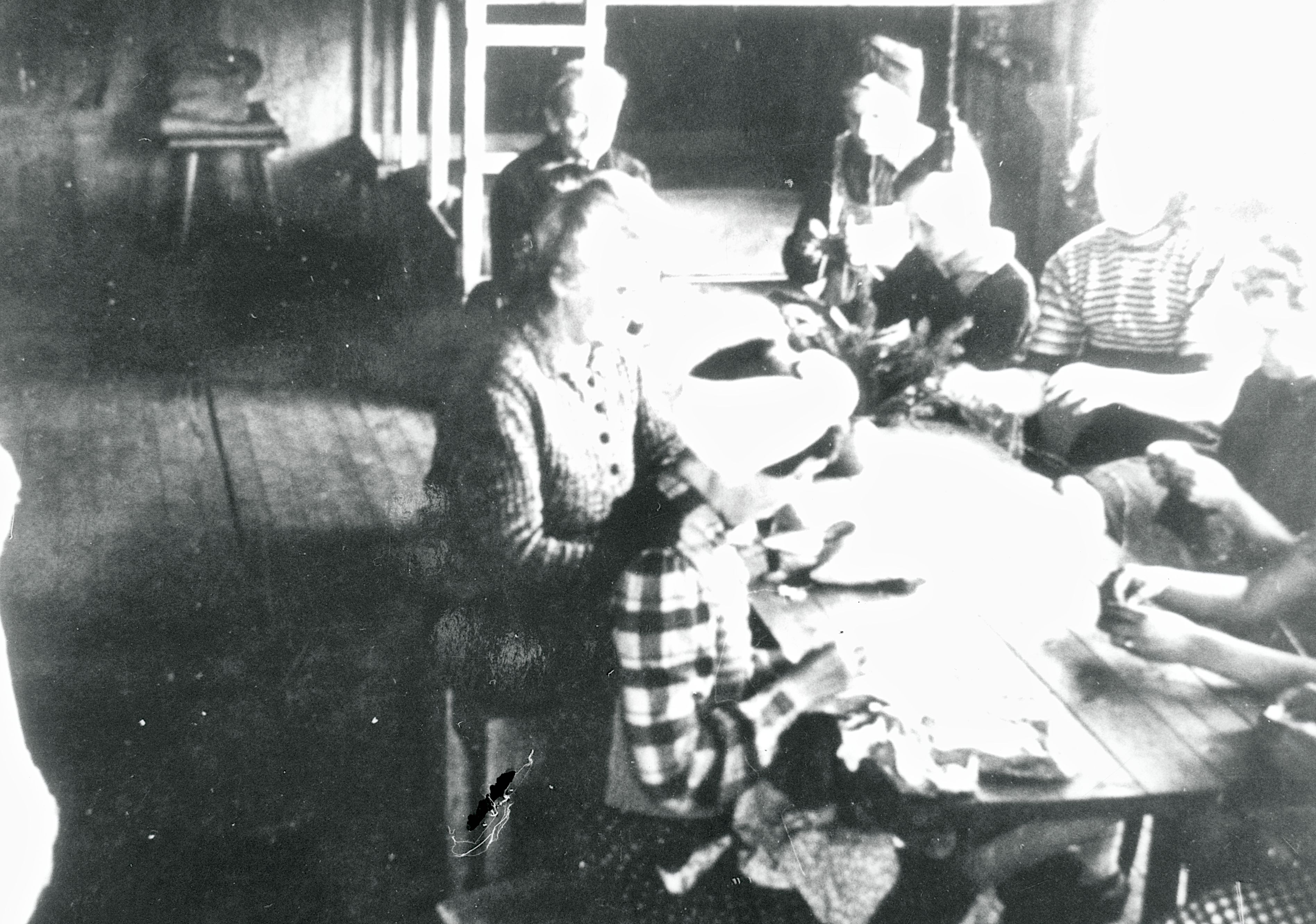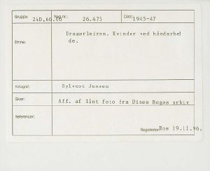 Maskingenkendt tekst fra fotokuvert: Dragør lejren. Kvinder ved håndarbejde.