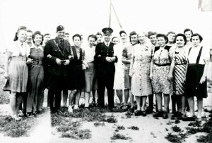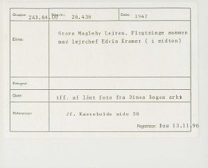 Maskingenkendt tekst fra fotokuvert: Store Magleby Lejren. Flygtninge sammen med lejrchef Edvin Kræmer ( i midten)
