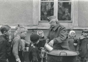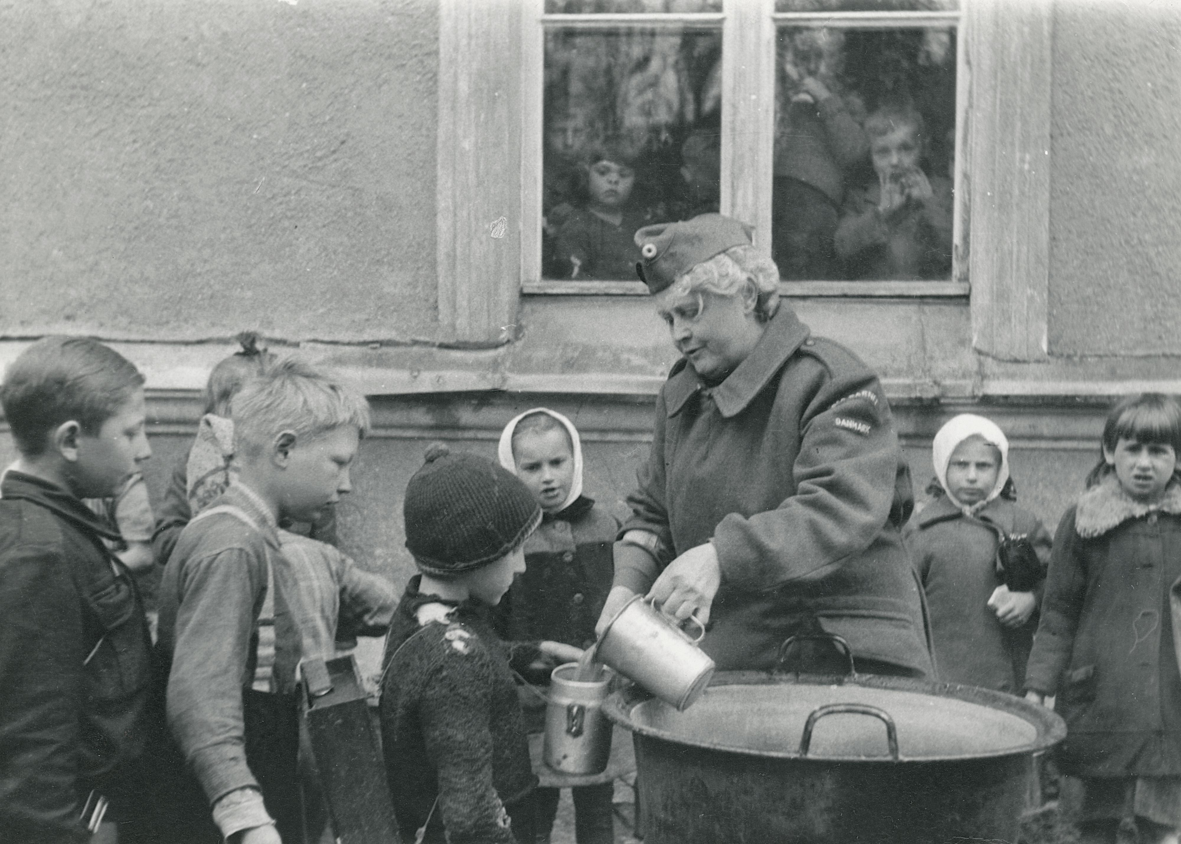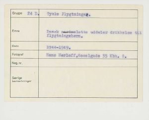 Maskingenkendt tekst fra fotokuvert: Dansk lotte uddeler drikkelse til flygtningebørn.