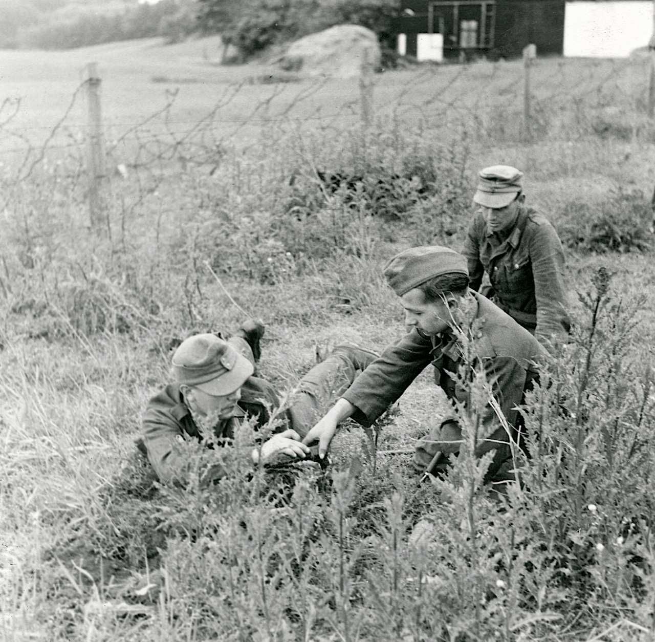 Tyske pionersoldater rydder tyske minefelter på den jyske vestkyst efter kapitulationen. Pressefoto udsendt af den allierede overkommendo SHAEF.