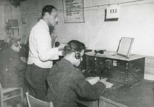 Maskingenkendt tekst fra fotokuvert: Indvendig i den store telegrafbunker, i Skanderborg Dyrhave. Jylland.