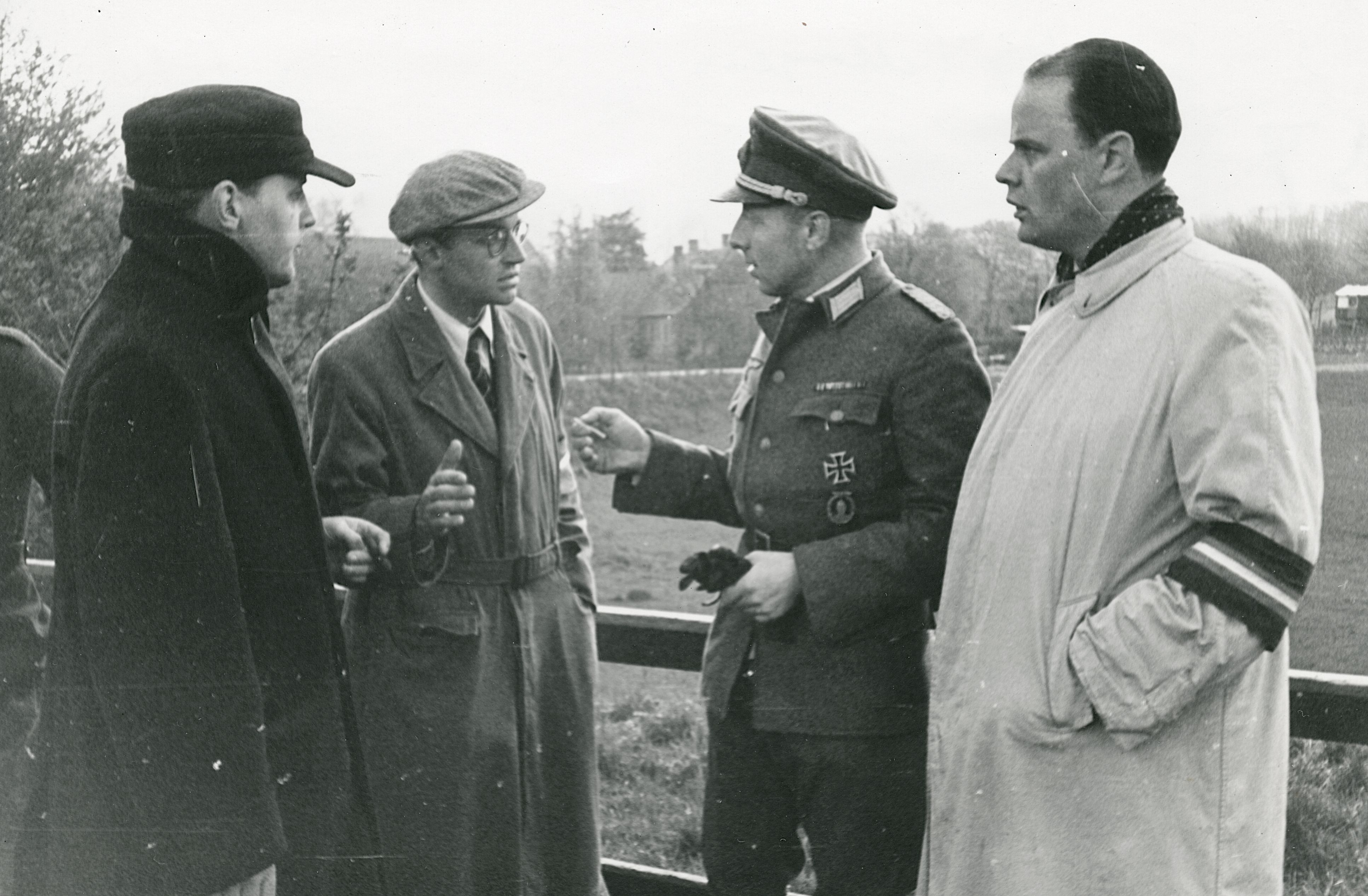 Maskingenkendt tekst fra fotokuvert: Krusaa Maj 1945 Lederen af de tyske tropper ved grænsen, corvettenkapitaen v. Førster, meddeler modstandsbevægelsen pressesekretær Skodshøj, Hedeselskabet, Captajn Jebseh og dr-phil. Jens Kruuse, at general Blücher har godkendt kapitulationen.