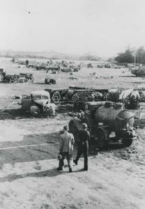 Maskingenkendt tekst fra fotokuvert: Tyske Militærvogne og udstyr ved Kruså. 5. maj 1945
