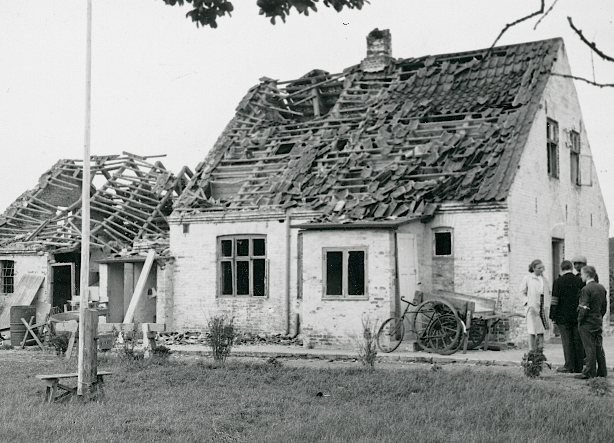 Maskingenkendt tekst fra fotokuvert: Beskadigede bygninger som følge af en eksplosion i miner, der var ved at blive læsset på en lastvogn. Strandskoven ved Esbjerg og dens omgivelser.
