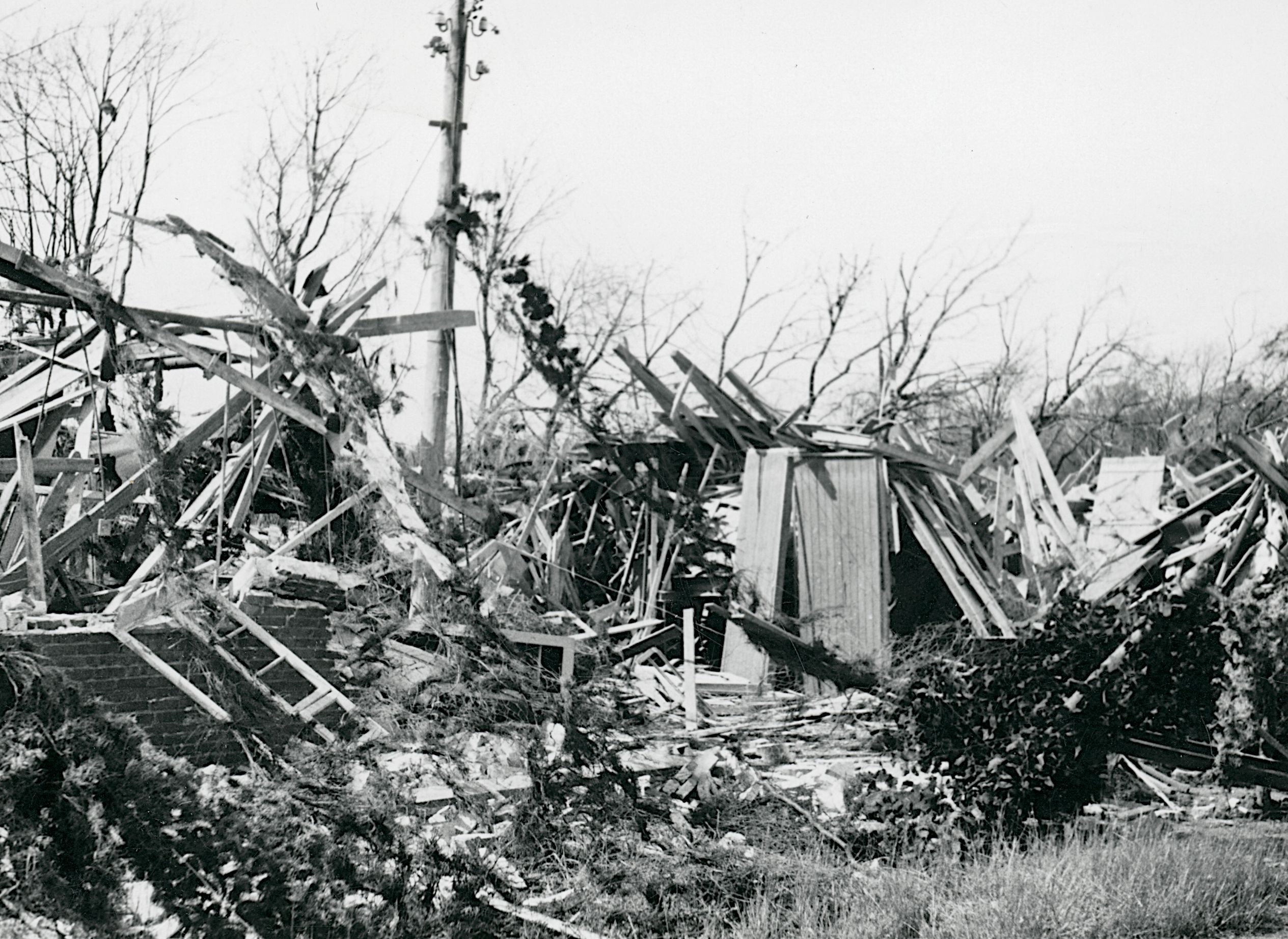 Maskingenkendt tekst fra fotokuvert: Beskadigede bygninger som følge af en eksplosion i miner, der var ved at blive læsset på en lastvogn. Strandskoven ved Esbjerg og dens omgivelser.