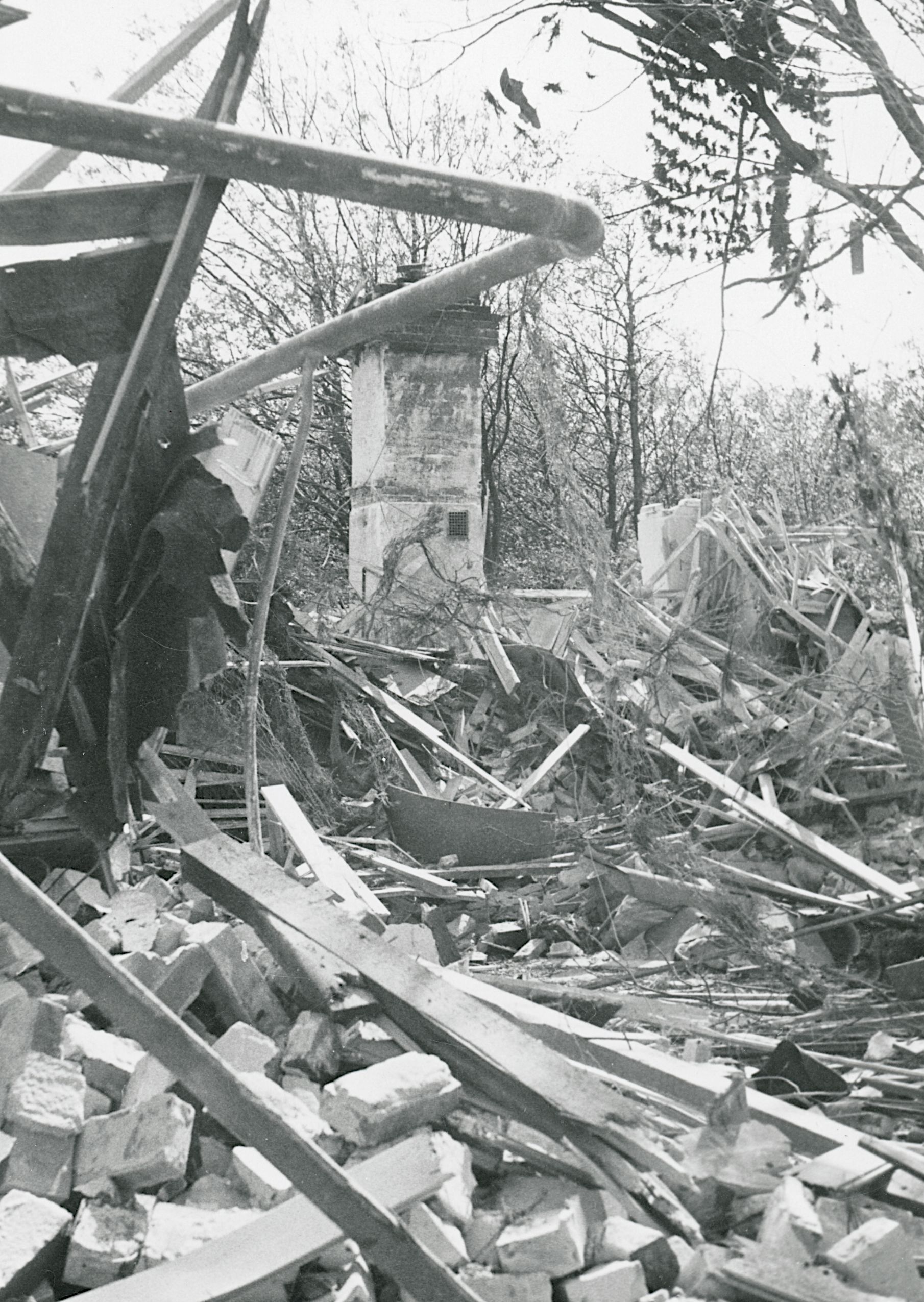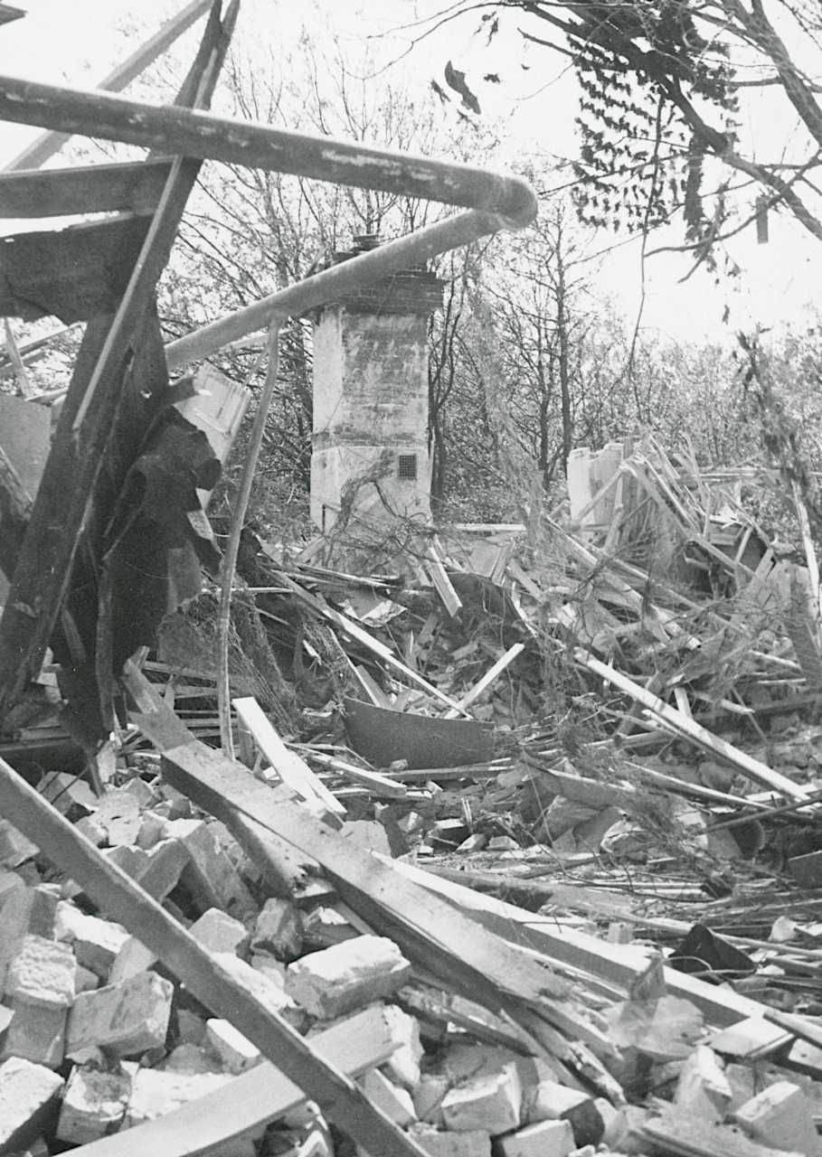 Maskingenkendt tekst fra fotokuvert: Beskadigede bygninger som følge af en eksplosion i miner, der var ved at blive læsset på en lastvogn. Strandskoven ved Esbjerg og dens omgivelser.