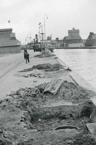 Maskingenkendt tekst fra fotokuvert: Kolding havn, 6.maj 1945 Sprænghuller. (til sprængning af kajen.)