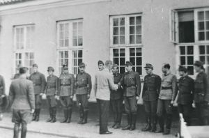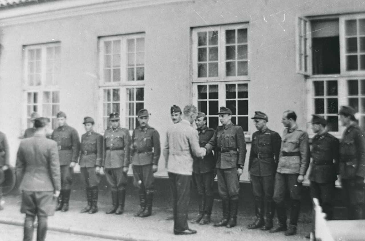 Maskingenkendt tekst fra fotokuvert: Orlogskaptajn I. legner, chef for kommando Birkerød hilser på befalingsmænd fra den vi ungarske battaljon, efter at den er forlagt til Sandholmlejren.