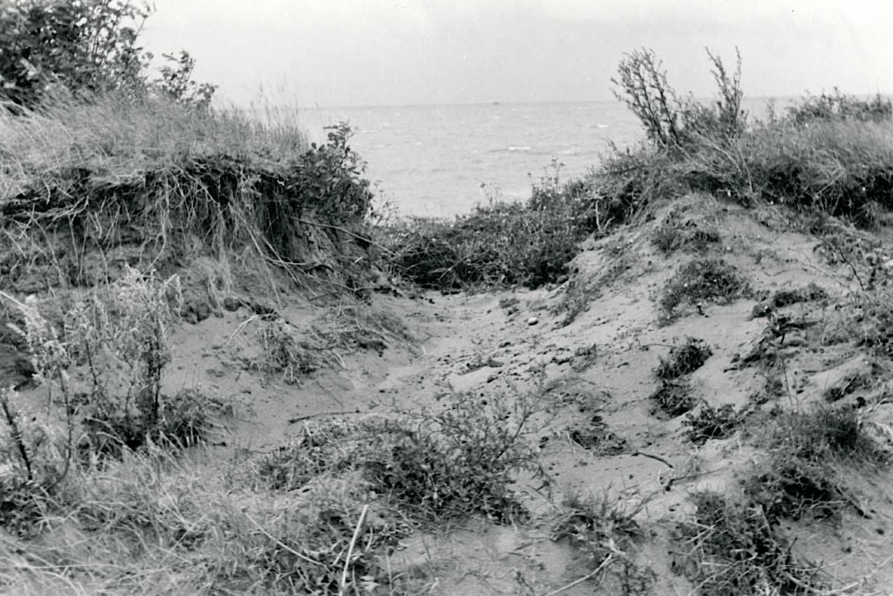 Maskingenkendt tekst fra fotokuvert: Gedser Odde. Dette smukt beliggende, højtliggende punkt skændede tyskerne også. Lige bag den høje lerklint, der var mere end faldefærdig, gravede tyskerne forsvarsstillinger.