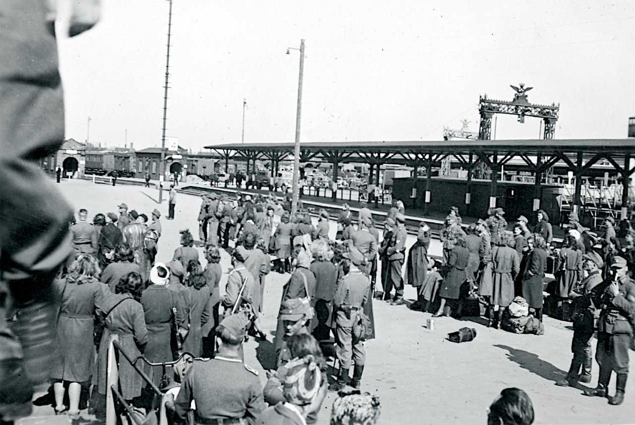 Maskingenkendt tekst fra fotokuvert: Tyske soldater på vej til færgen i Korsør
