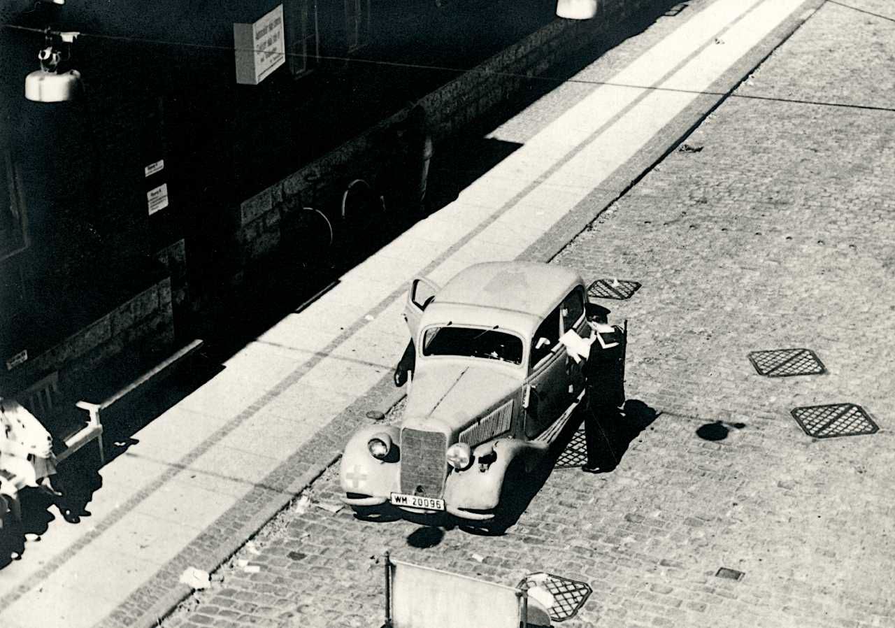 Maskingenkendt tekst fra fotokuvert: Mariner kontrollerer papirerne hos en tysk chauffeur i en tysk Røde Kors bil. Frihavnen. Taget fra Frihavnsbroen.