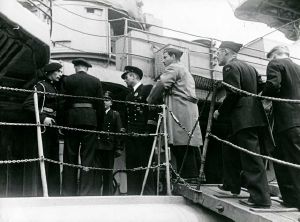 Maskingenkendt tekst fra fotokuvert: Overgivelsen af en tysk krydser, enten Nürnberg ell. Prinz Eugen til admiral Holt.