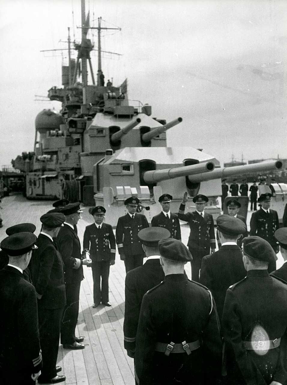 Maskingenkendt tekst fra fotokuvert: Overdragelsen af en tysk krydser- enten "Nürnberg " ell. ""Prinz Eugen" til admiral Holt. Tyske og engelske marine officerer