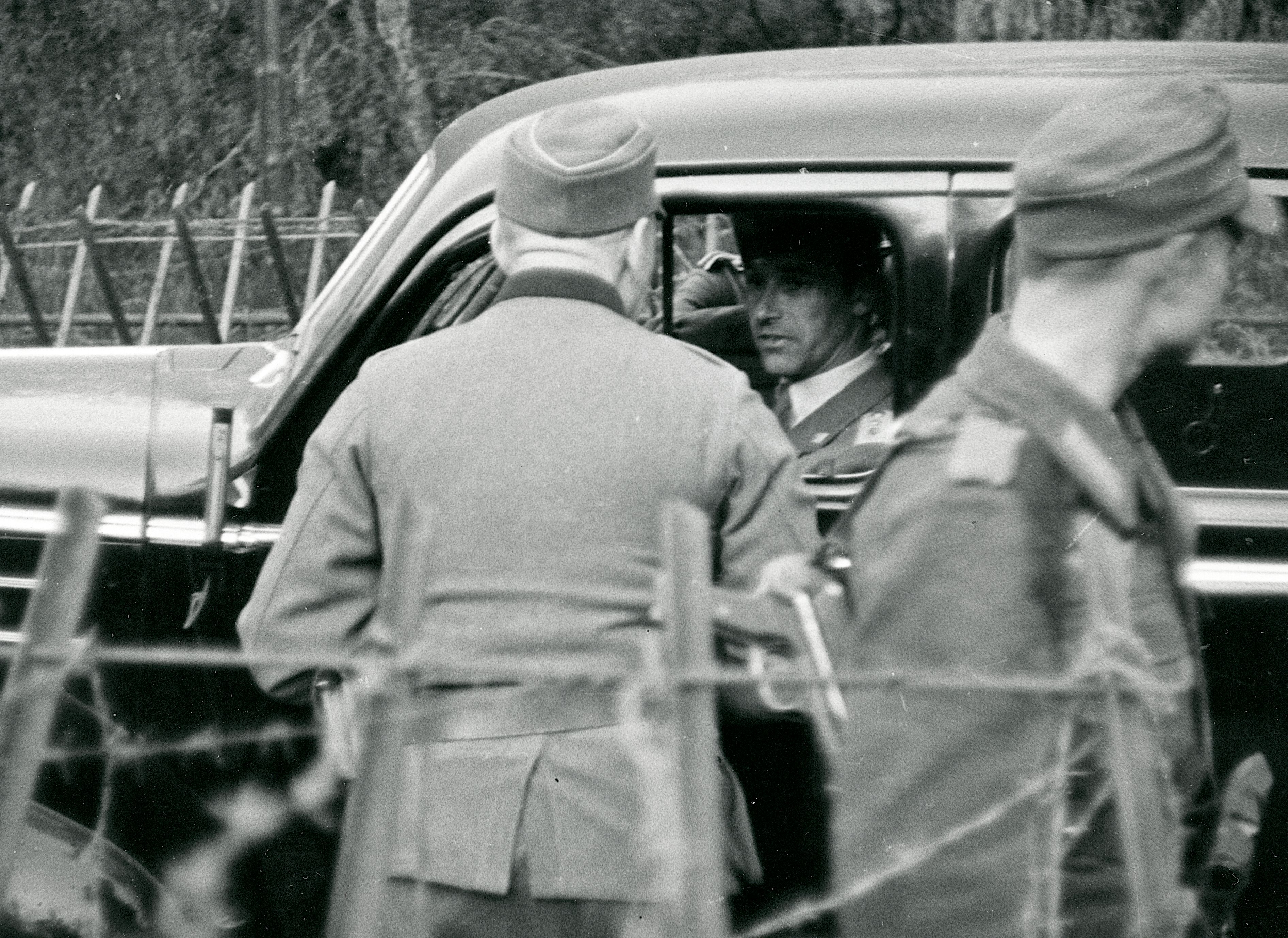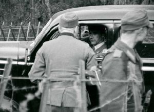 Maskingenkendt tekst fra fotokuvert: To tyske soldater og en militær modstandsmand i samtale.