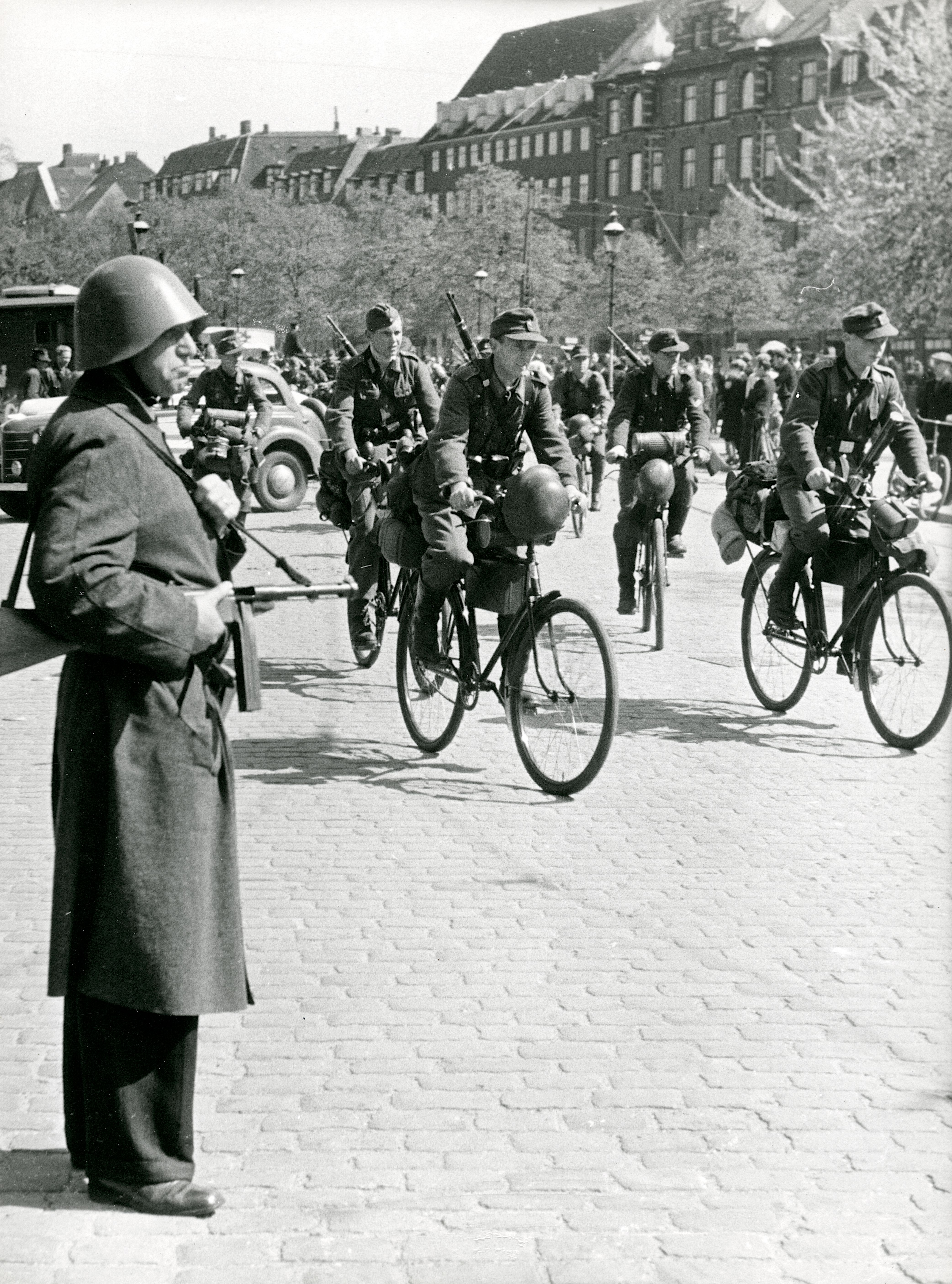 Maskingenkendt tekst fra fotokuvert: Tyske soldater på cykel kører fra Nørre Voldgade over krydset mod Jarmers Plads ned mod Jarmersgade.