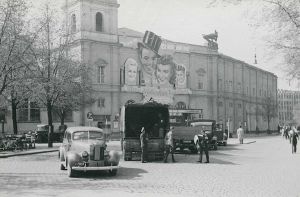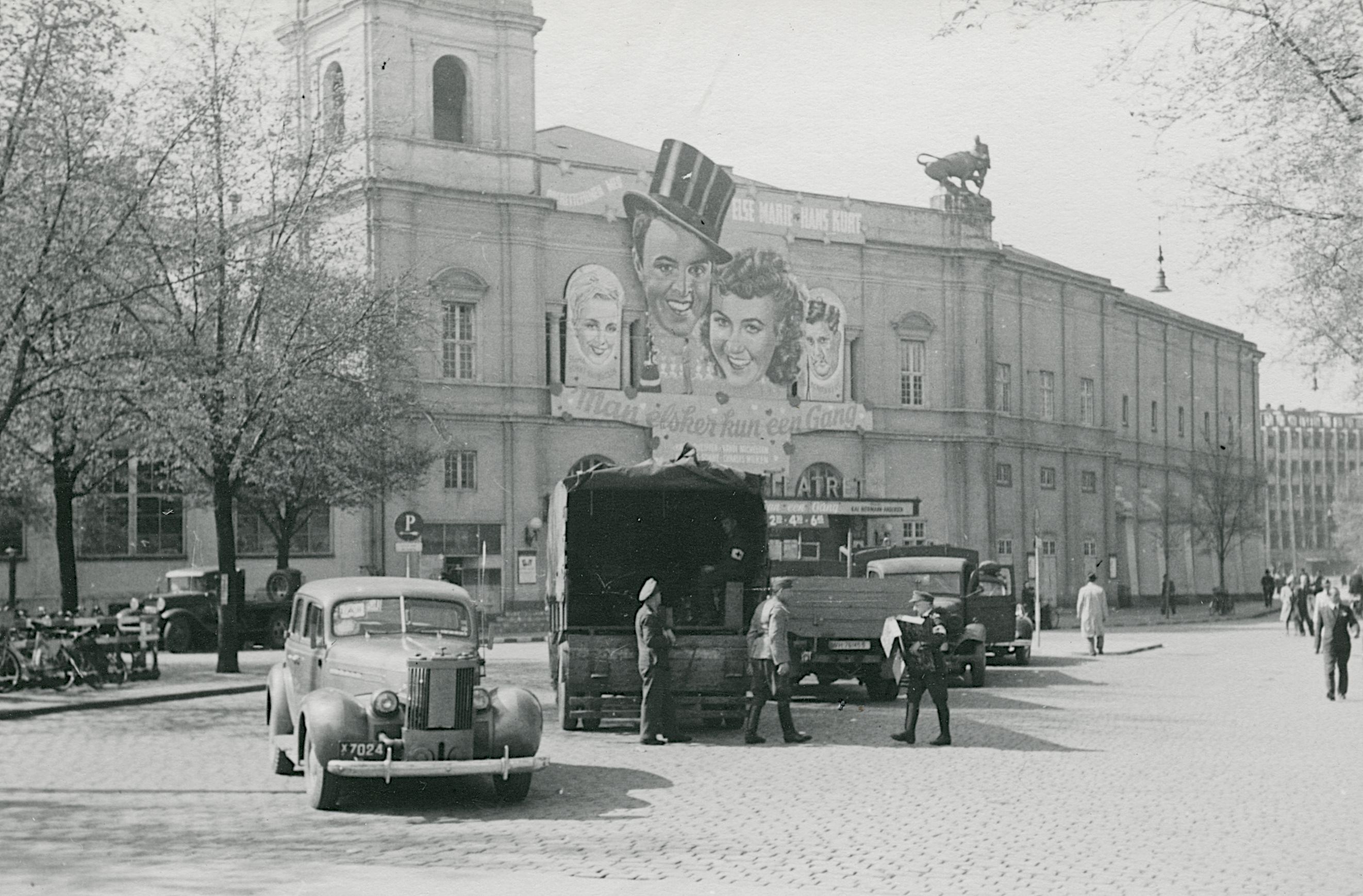 Maskingenkendt tekst fra fotokuvert: Tyske soldater foran Vægtergården ved Palads Teatret forbereder sig på afrejse?