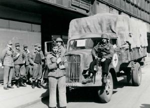 Maskingenkendt tekst fra fotokuvert: København. De sidste tyskere forlader Vesterport.