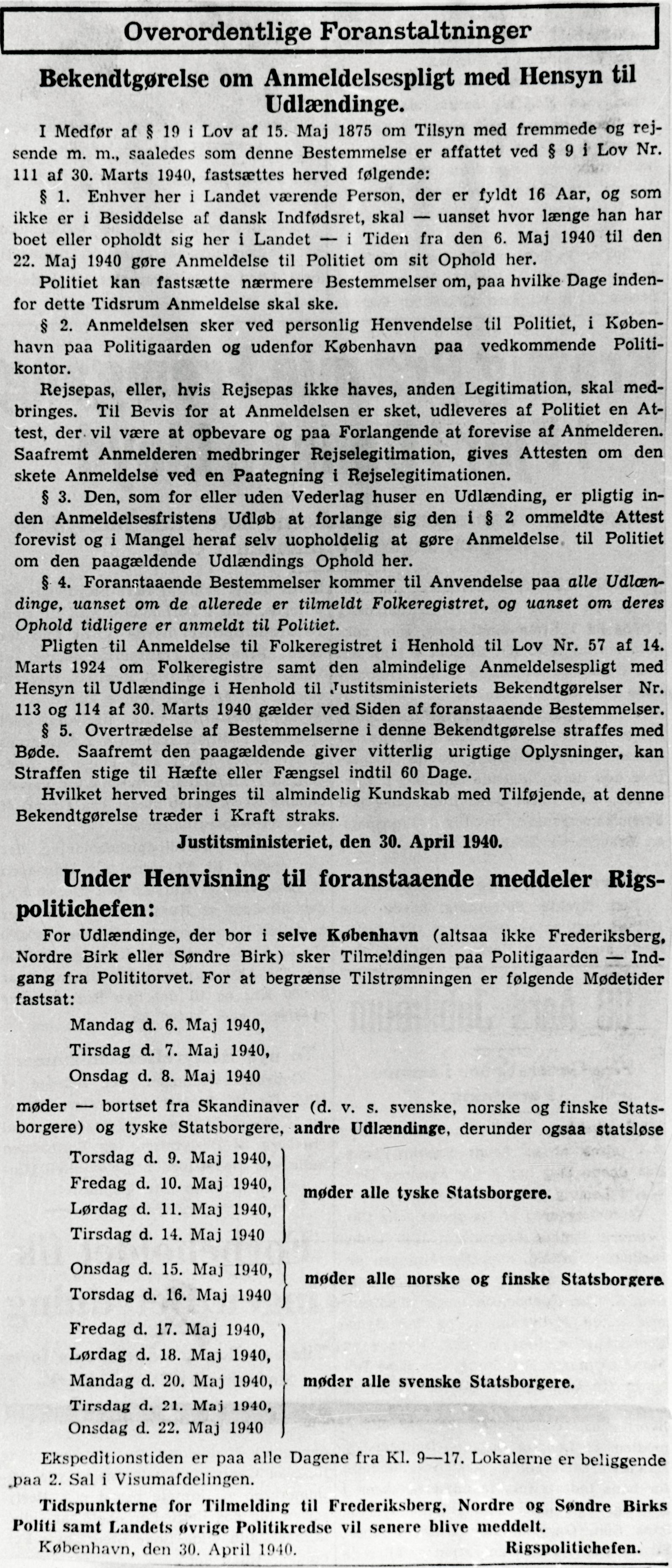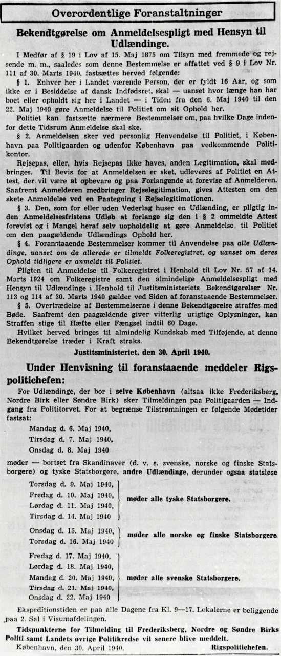 Maskingenkendt tekst fra fotokuvert: Bekendtgørelse fra Justitsministeriet om anmeldelsespligt med hensyn til udlændinge.