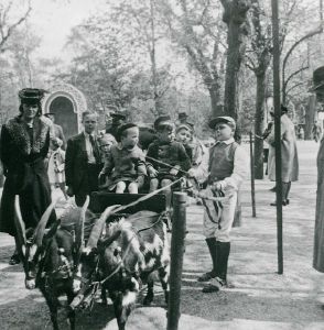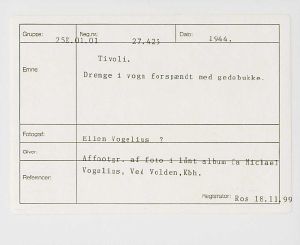 Maskingenkendt tekst fra fotokuvert: Tivoli. Drenge i vogn forspændt med gedebukke.