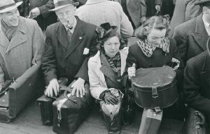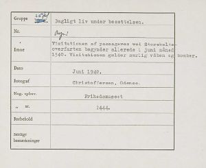 Maskingenkendt tekst fra fotokuvert: I Visitationen af passagerer ved Storebæltsoverfarten begynder allerede i juni måned 1940 Visitationen gælder særlig våben og bomber.