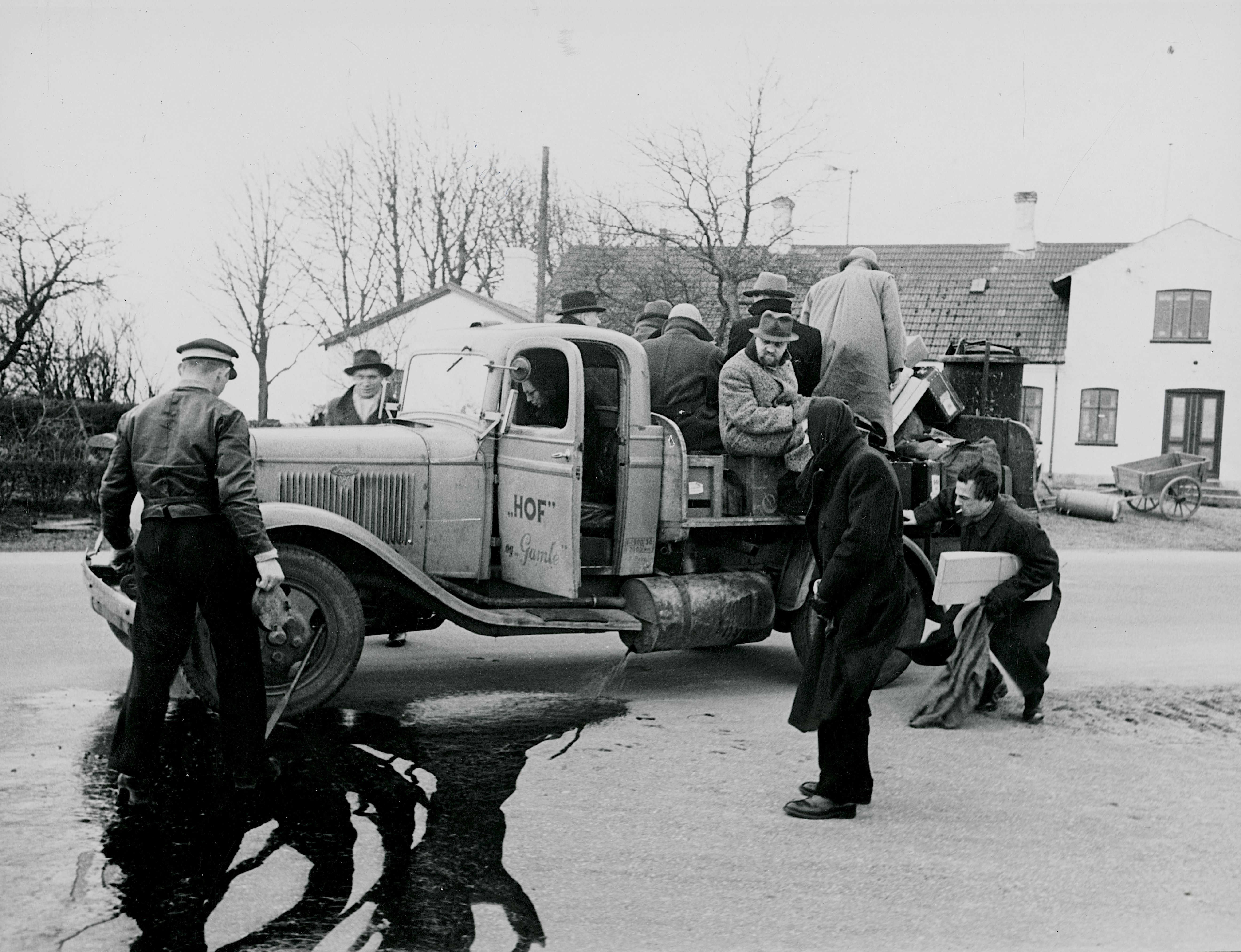 Grovfiltret på en bil med gas-generator tømmes, og tjære og andre urenheder, som er blevet dannet ved forbrændingen, strømmer ud på vejen.