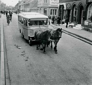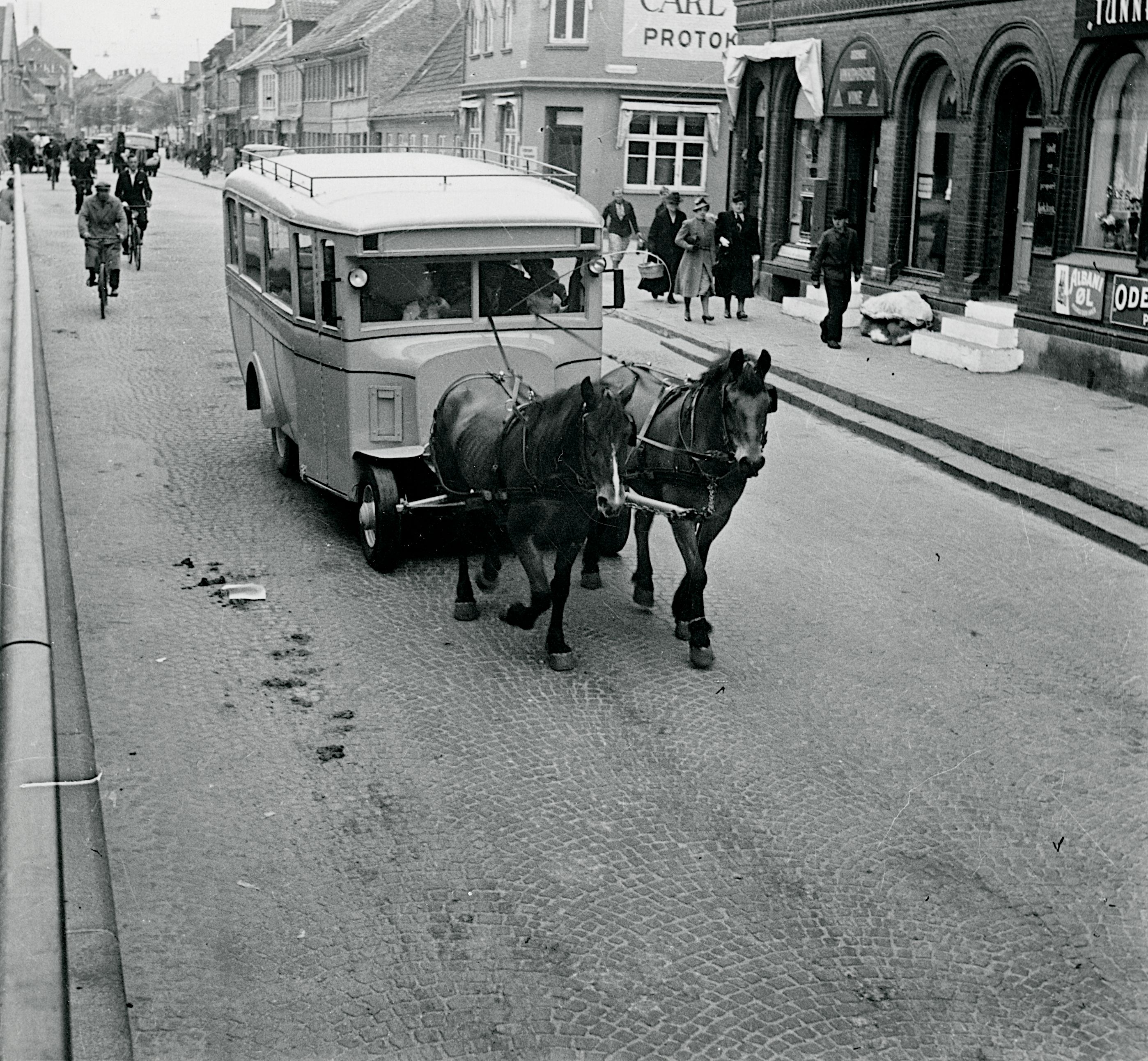Maskingenkendt tekst fra fotokuvert: Biler bliver trukket af heste grundet manglen på benzin.