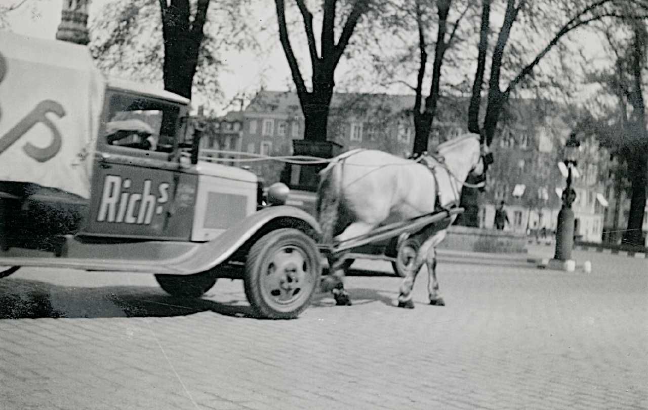 Maskingenkendt tekst fra fotokuvert: Kaffefirmaet Richs bruger heste til transport, mangel på Benzin.