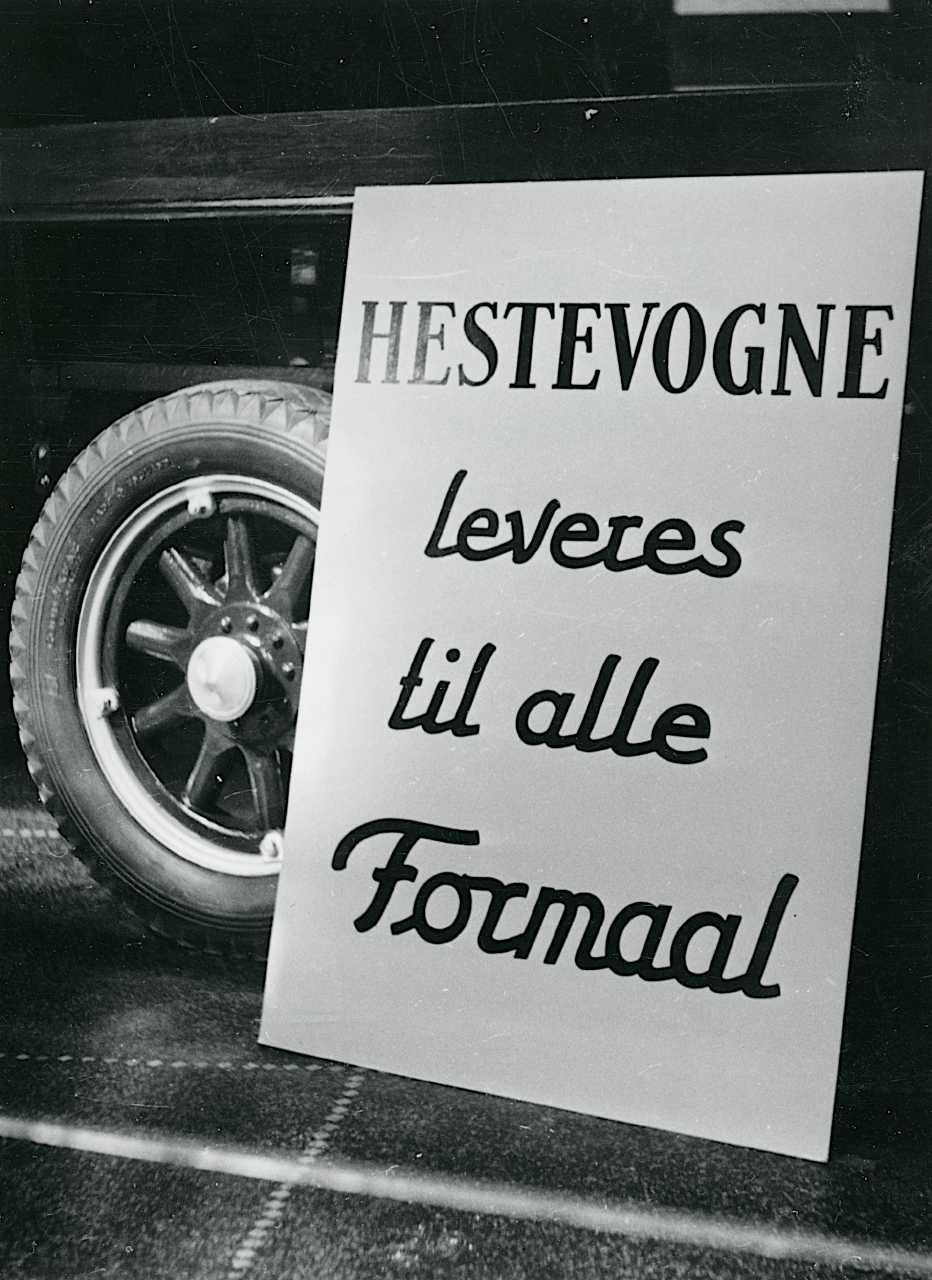 Maskingenkendt tekst fra fotokuvert: Plakat med påskriften "Hestevogne leveres til alle formål."