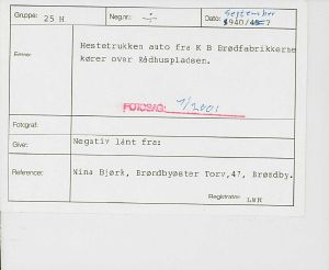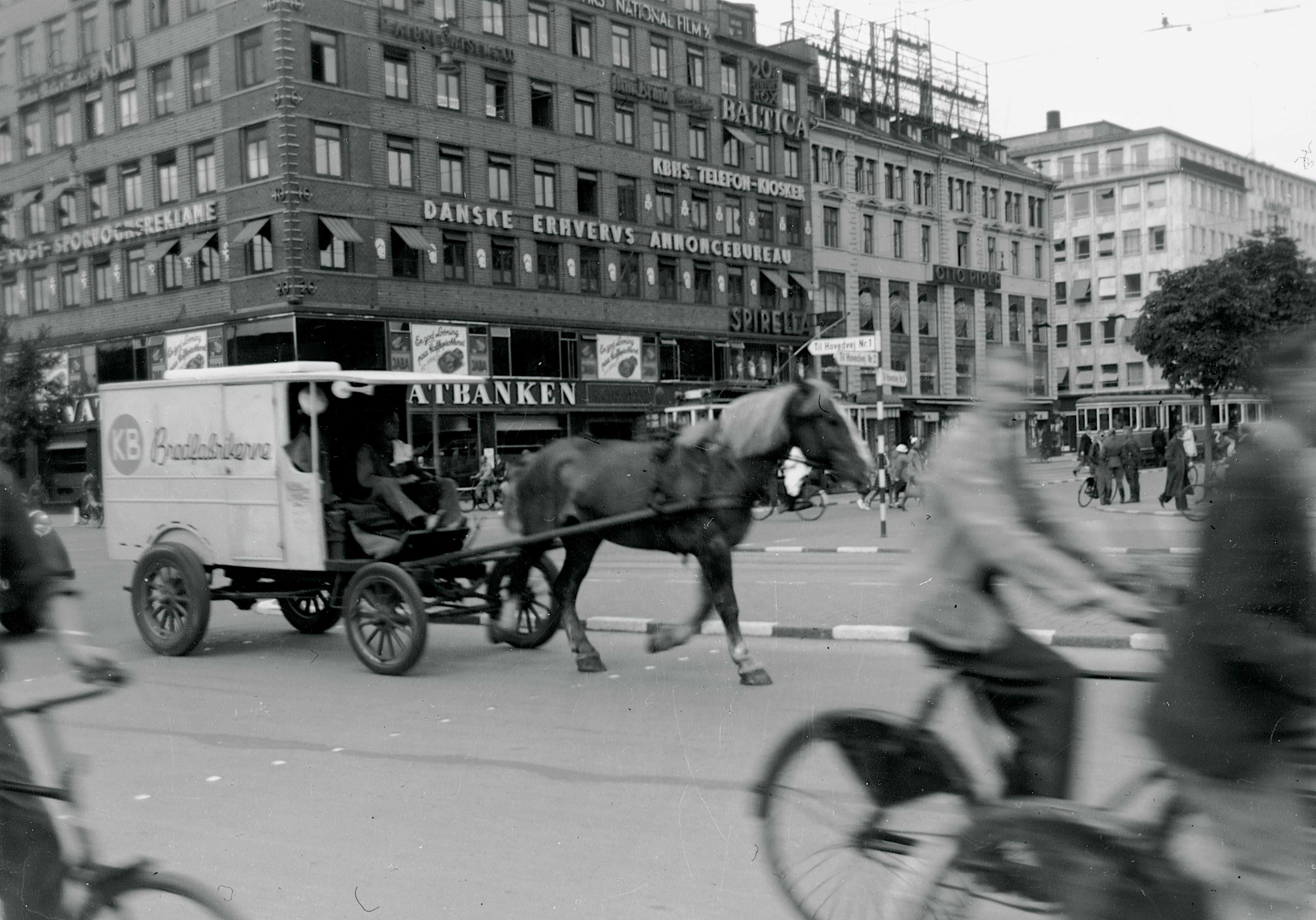 Maskingenkendt tekst fra fotokuvert: Hestetrukken auto fra KB Brødfabrikkerne kører over Rådhuspladsen.