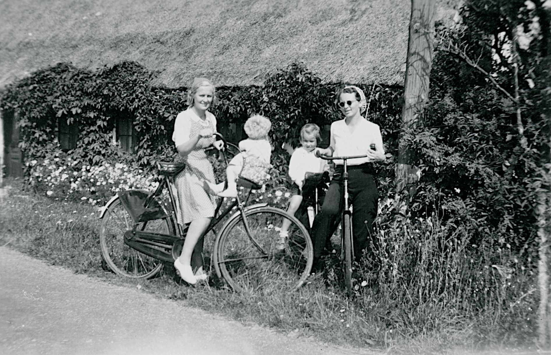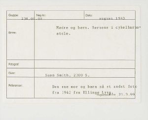 Maskingenkendt tekst fra fotokuvert: Mødre og børn. Børnene i cykelbærestole.