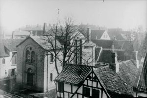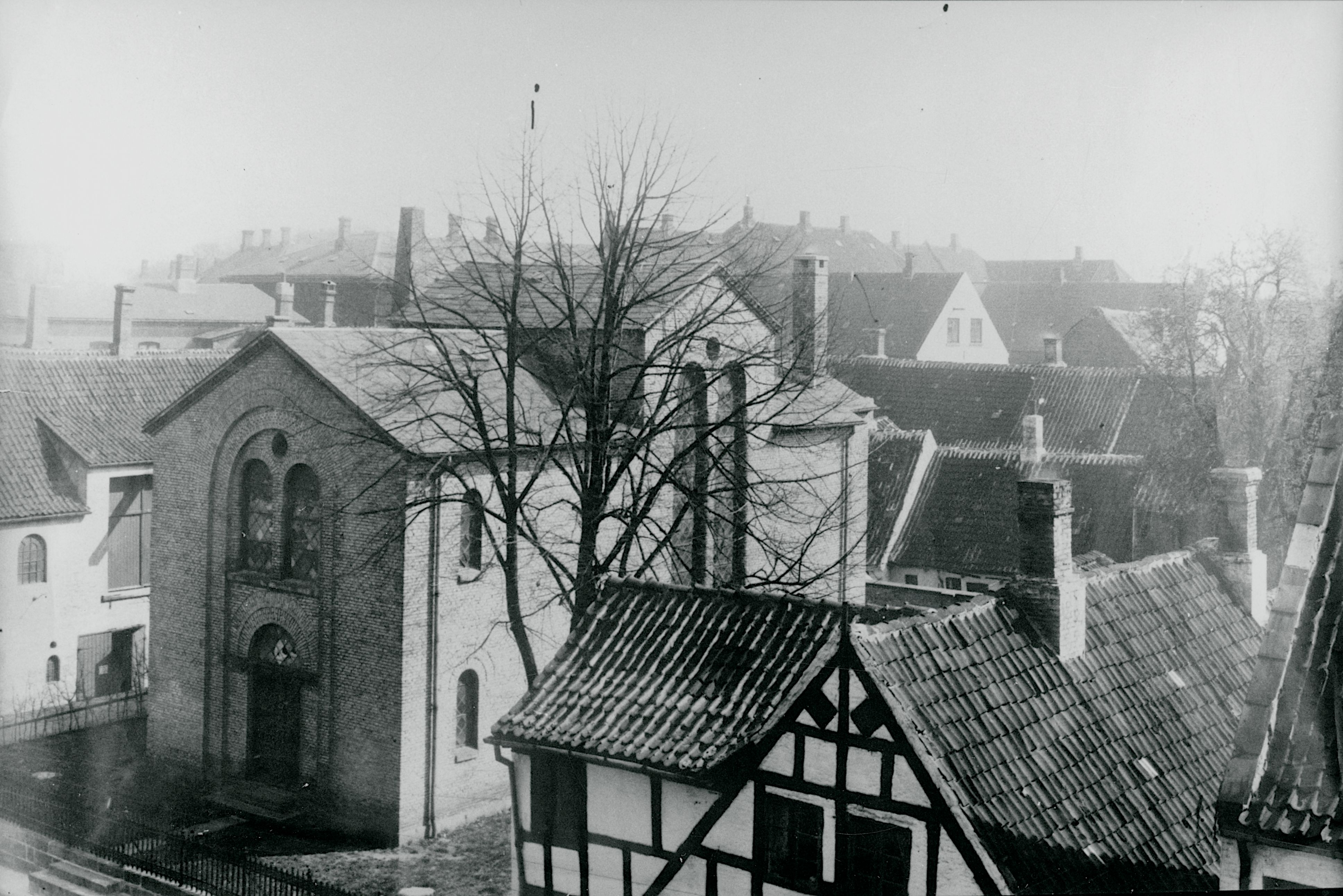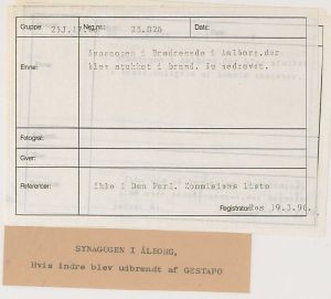 Maskingenkendt tekst fra fotokuvert: Synagogen i Bredegade i Aalborg, der blev stukket i brand. Nu nedrevet.