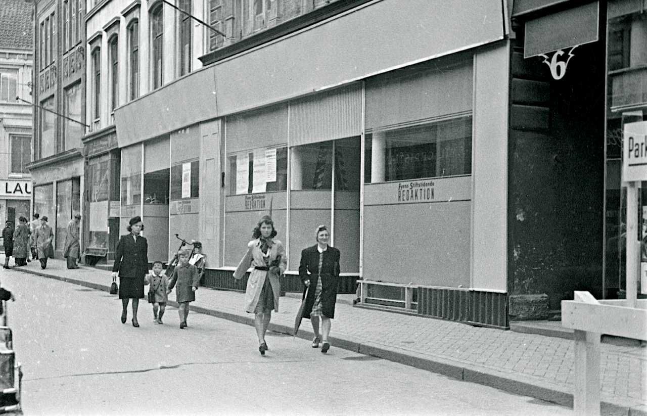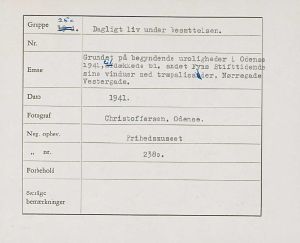 Maskingenkendt tekst fra fotokuvert: Grundet på begyndende uroligheder i Odense 1941 afdækkede bl. andet Fyns Stifttidende sine vinduer med træpalisader, Nørregade Vestergade.
