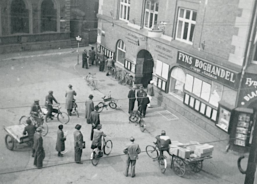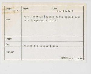 Maskingenkendt tekst fra fotokuvert: Fyns Tidendes bygning herpå fotoet blev schalburgteret 21.2.45.