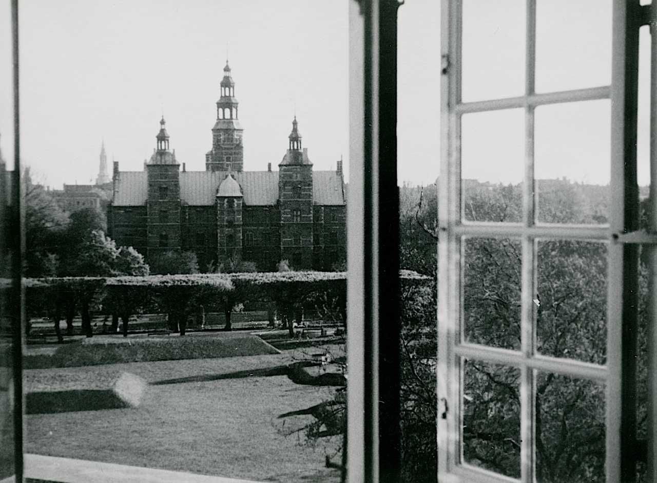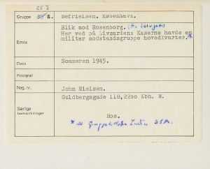 Maskingenkendt tekst fra fotokuvert: Blik mod Rosenborg. Her på Livgardens Kaserne havde en militær modstandsgruppe hovedkvarter.