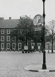 Maskingenkendt tekst fra fotokuvert: Tom parkeringsplads ved Palace-hotellet i baggrunden
