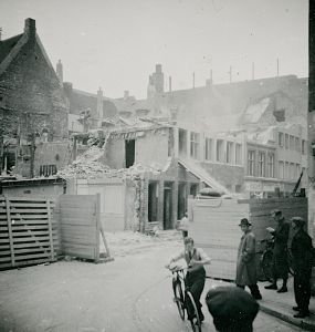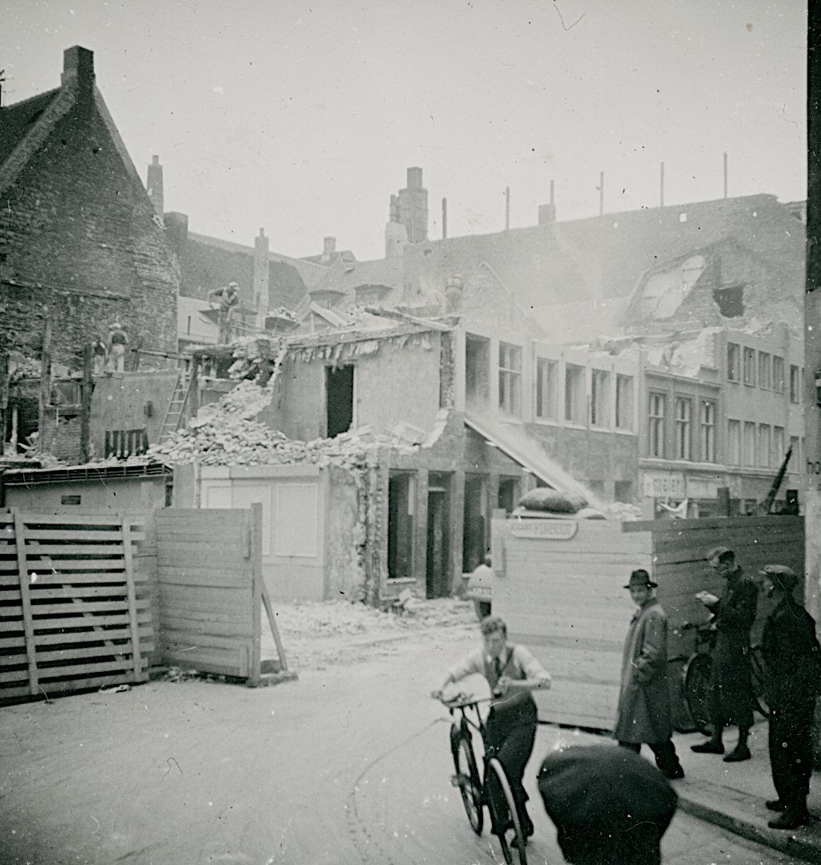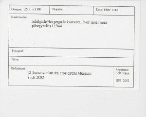 Maskingenkendt tekst fra fotokuvert: Adelgade/Borgergade kvarteret, hvor saneringen påbegyndtes i 1944